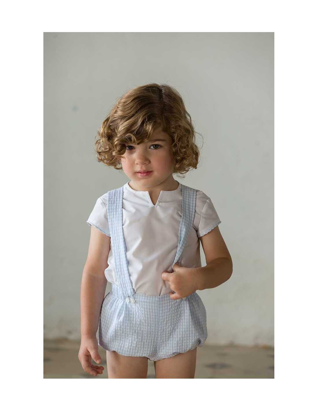 Conjunto ideal de bebé niño con blusa blanca de manga corta y bombacho de cuadritos azules con tirantes de la firma de moda infantil Cocote.