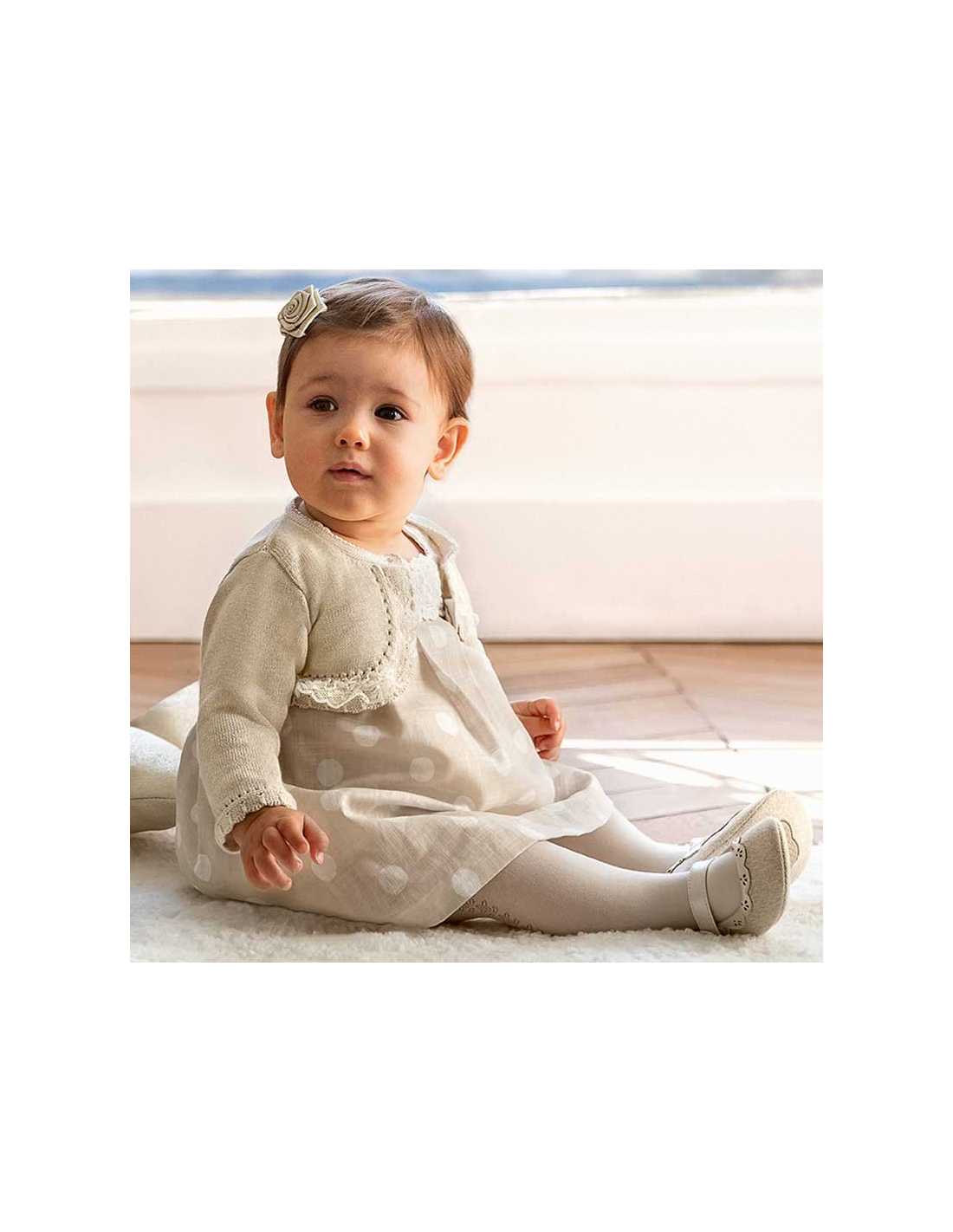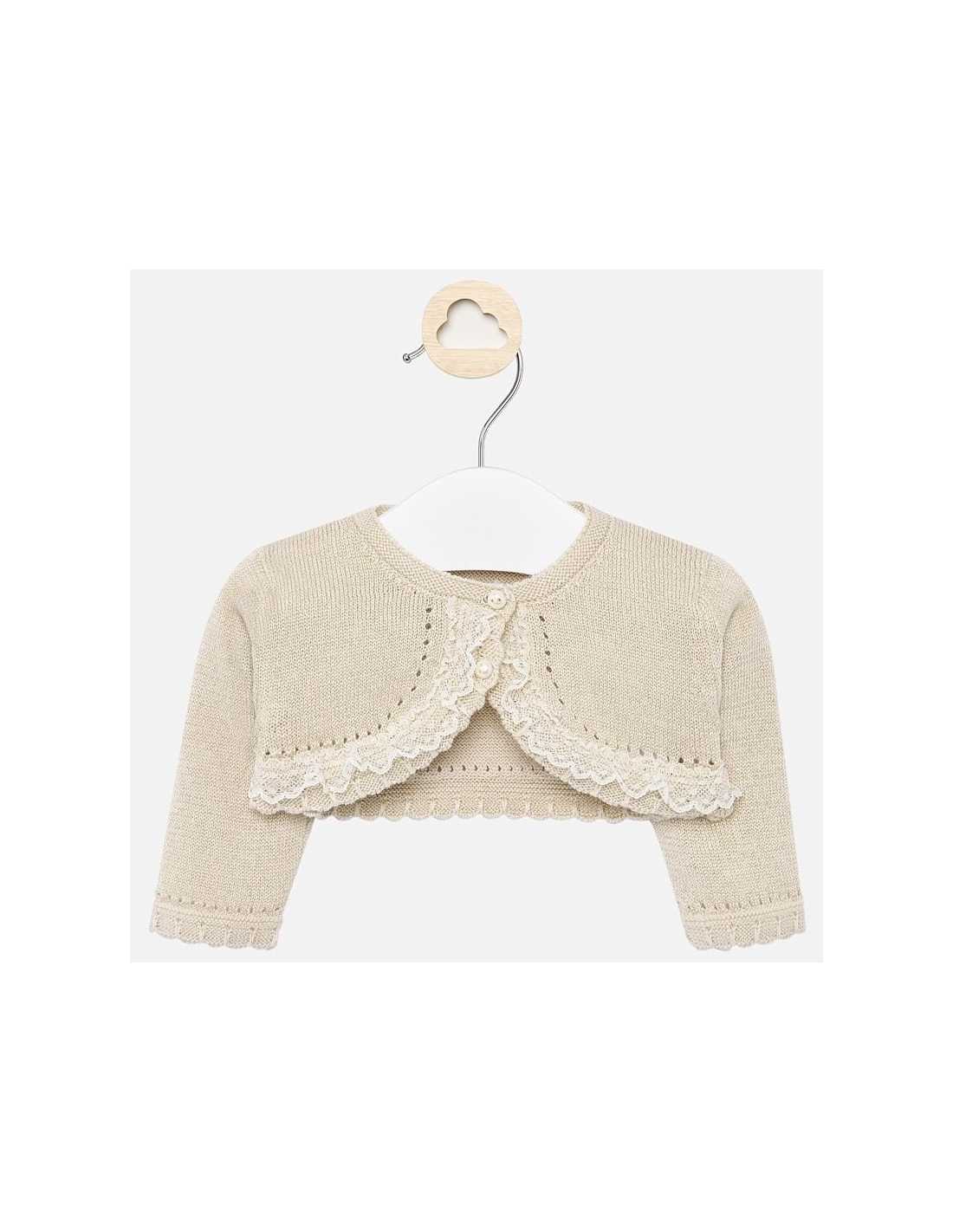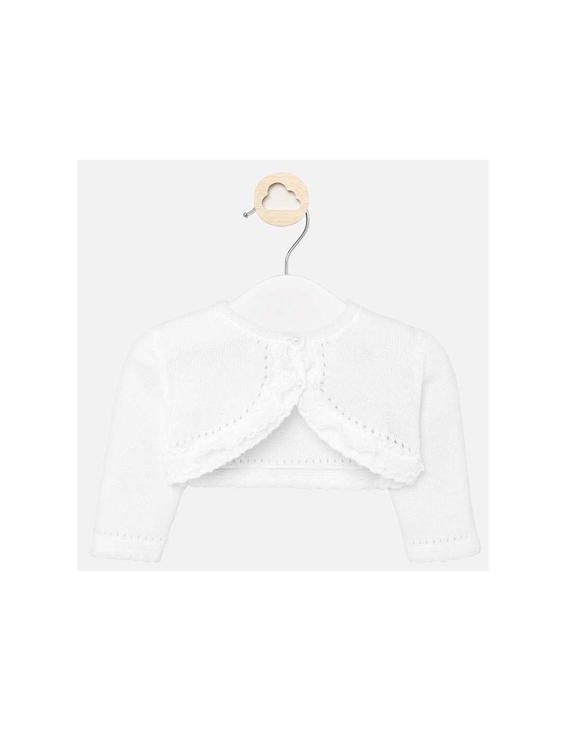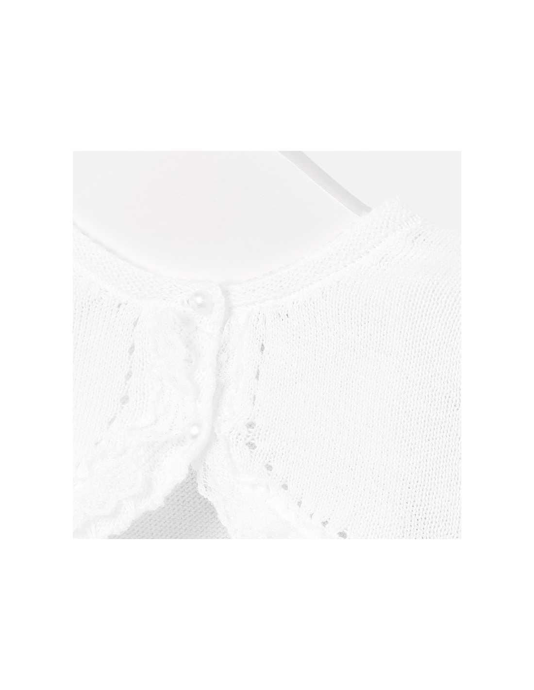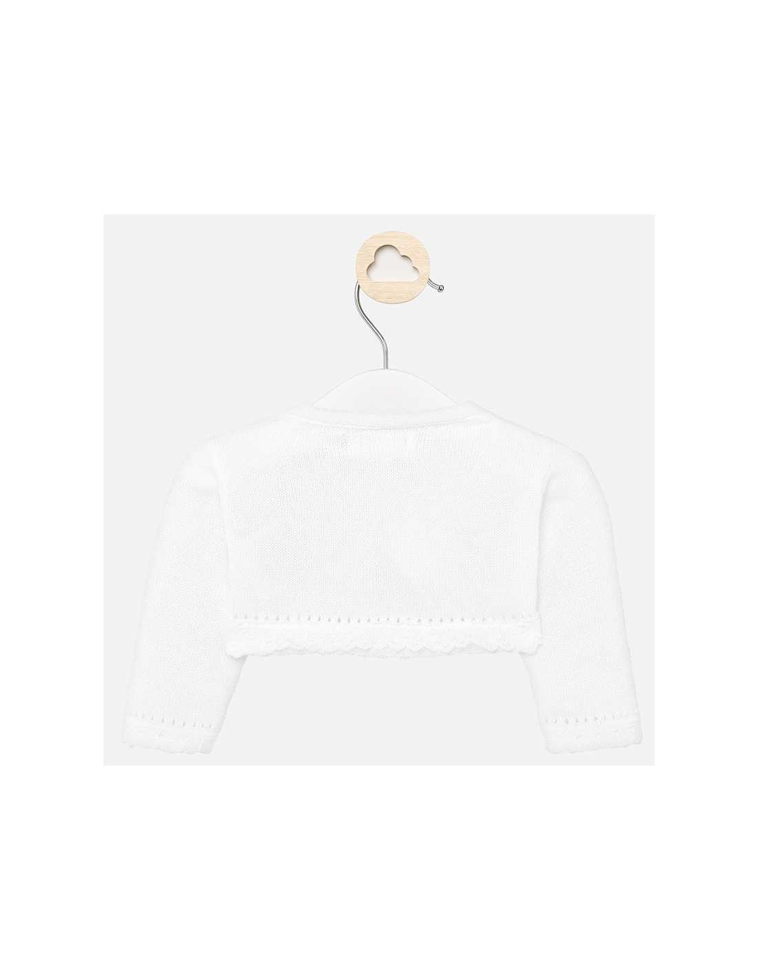 Rebeca de manga larga para bebé niña recién nacida con detalles a contraste. Cuello redondo. Cierre con botones en el cuello para facilitar el ajuste. Tejido 100% algodón. Diseño con terminaciones en ondas. Elementos de adorno: motivos calados, encajes.
