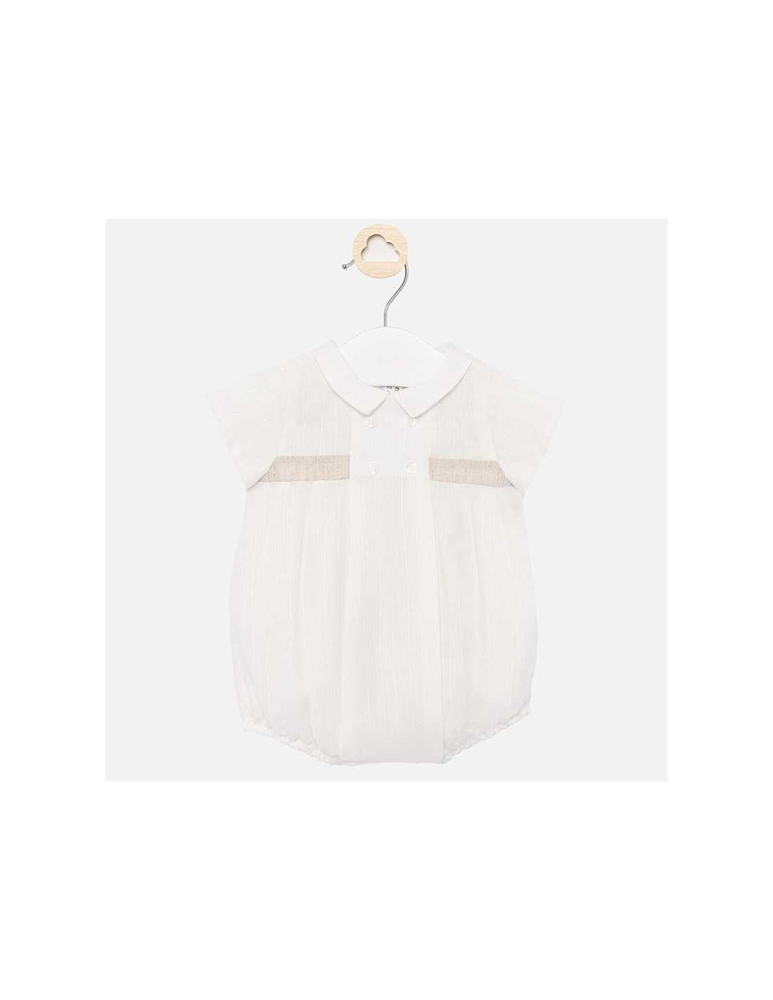 Pelele para bebé niño recién nacido. Cuello camisero. Cierre con botones a presión. Tejido de aspecto fresco y actual con lino. Elementos de adorno: botones decorativos, cinta decorativa a contraste.
