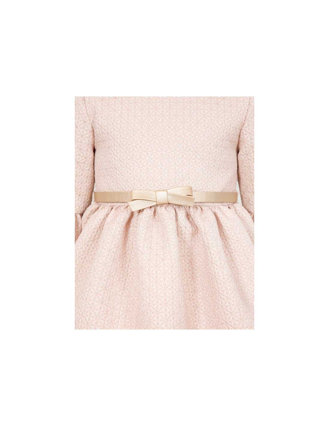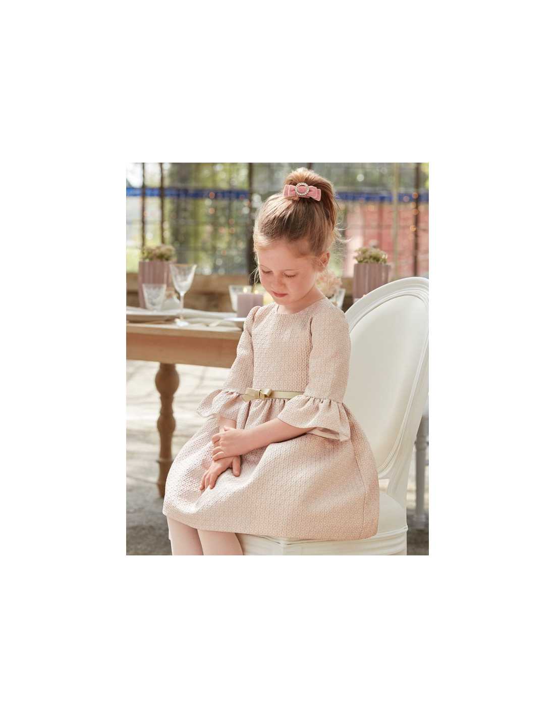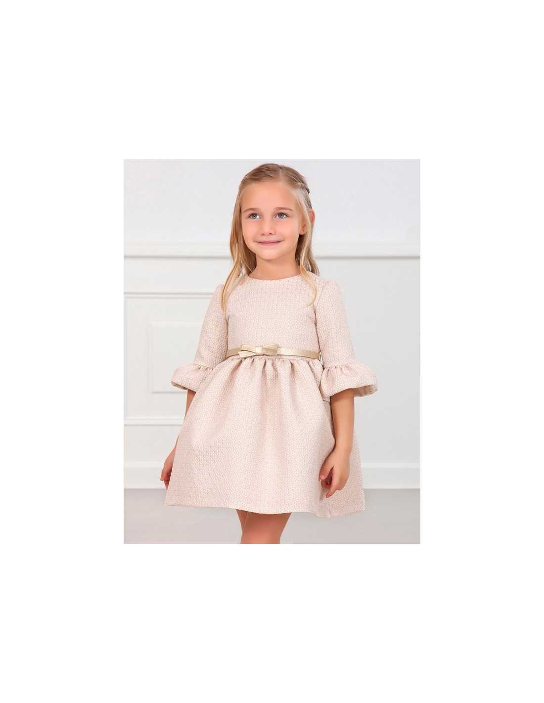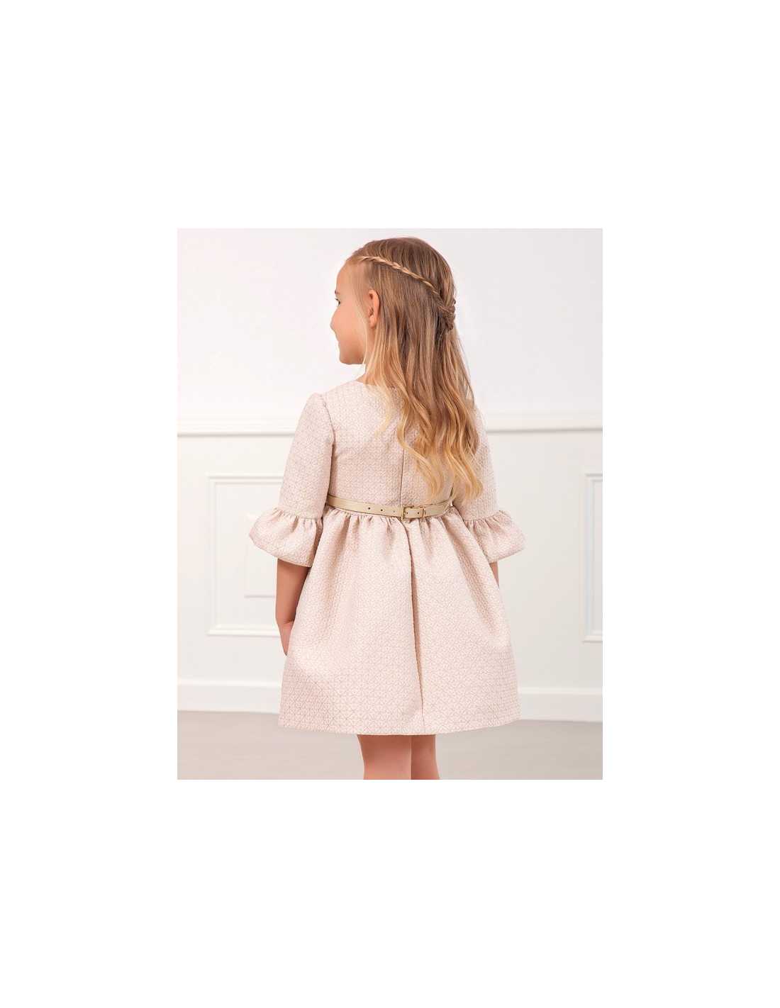 Sofisticado vestido con mangas francesas con acabados de volantes. Cinturón dorado incluido en la prenda. Cierre de cremallera invisible en la espalda. Ideal para lucir en ocasiones especiales.