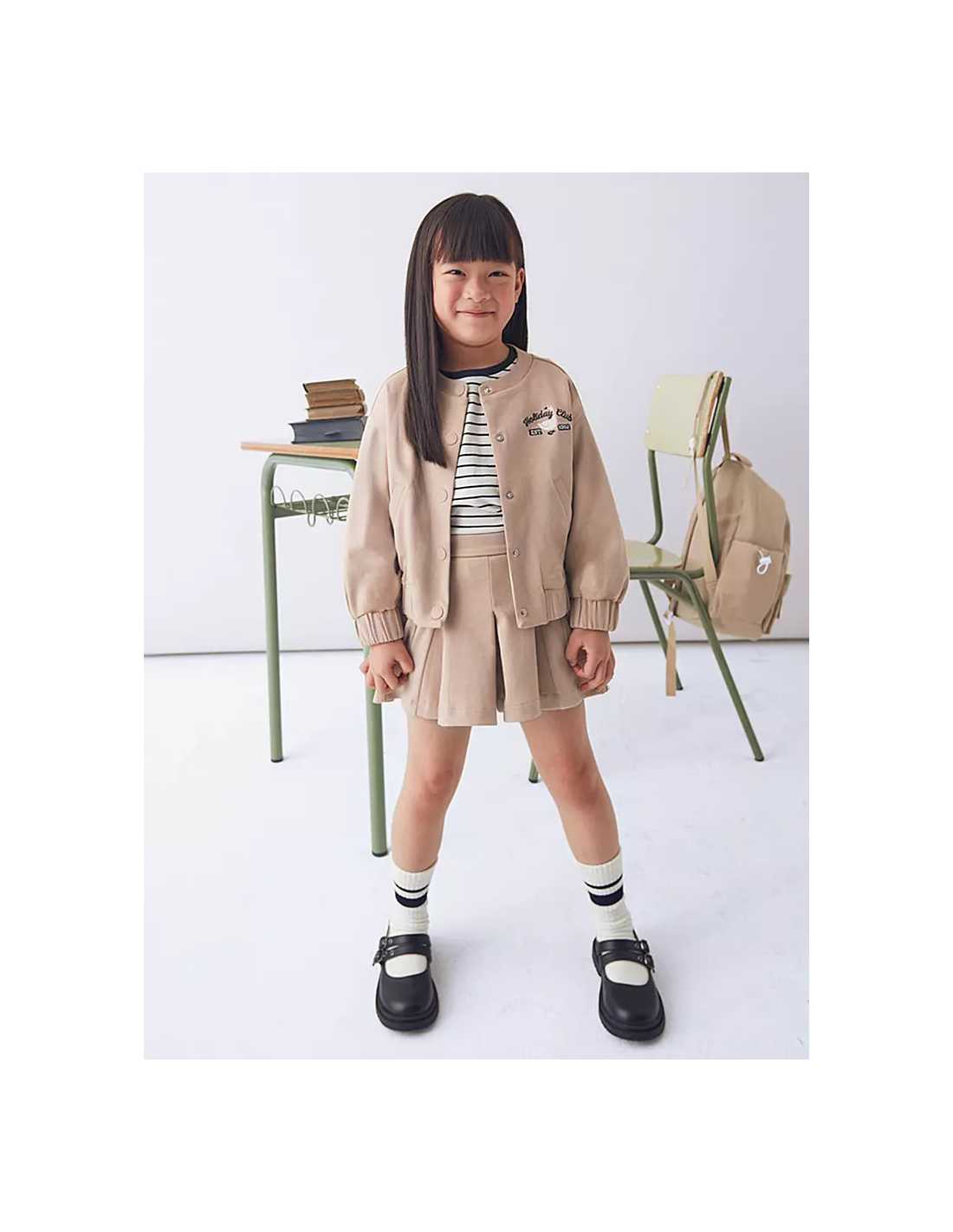 Cazadora de líneas relajadas para niña. Cierre con botones en la parte delantera. Cómodo tejido de sarga de gran resistencia. Bolsillos delanteros decorativos simulados. Elementos de adorno: bordado. Se trata de un artículo de diseño unisex de gran versatilidad por la neutralidad de sus tonos y su forma.