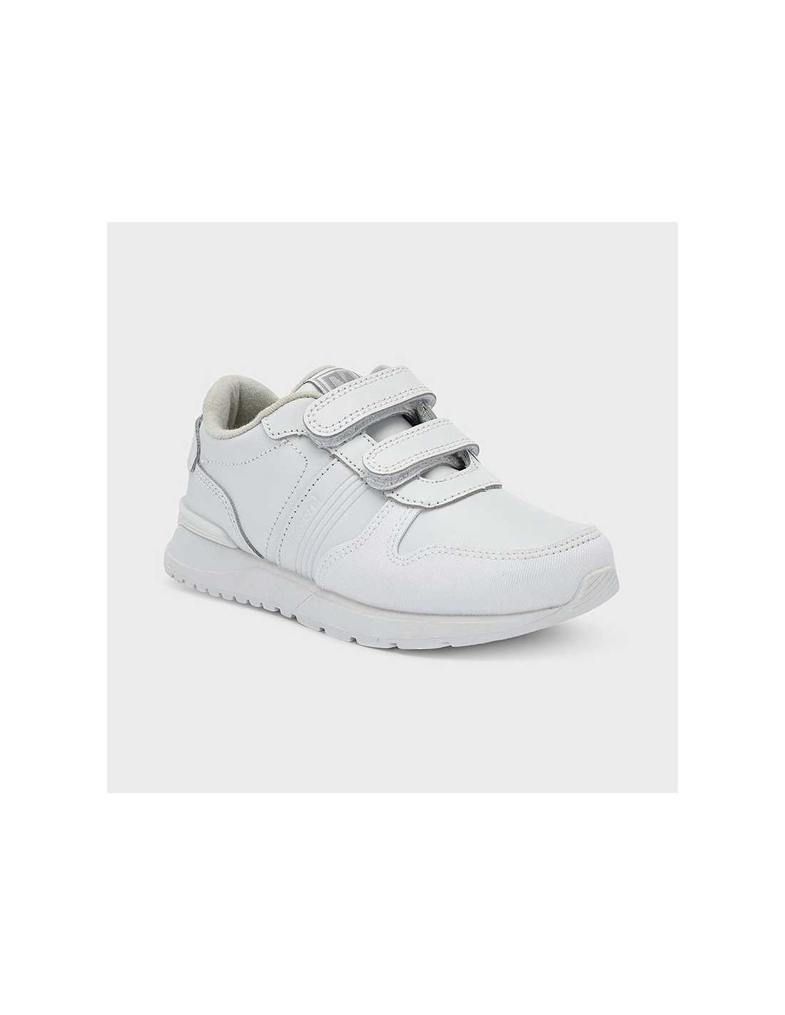 Zapatillas deportivas colegiales para niño, gran versatilidad para sus aventuras diarias. Revestimiento exterior de piel. Cierre regulable con doble velcro para una puesta rápida y un mejor ajuste. Refuerzo de goma en la puntera para mejorar la resistencia y durabilidad del calzado. Plantilla antibacteriana. Modelo disponible en las tallas 26 a 30 y en las tallas 36 a 38.