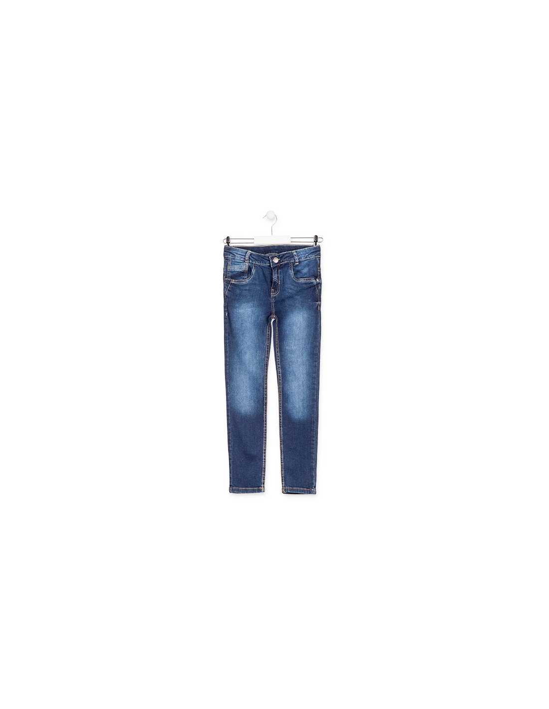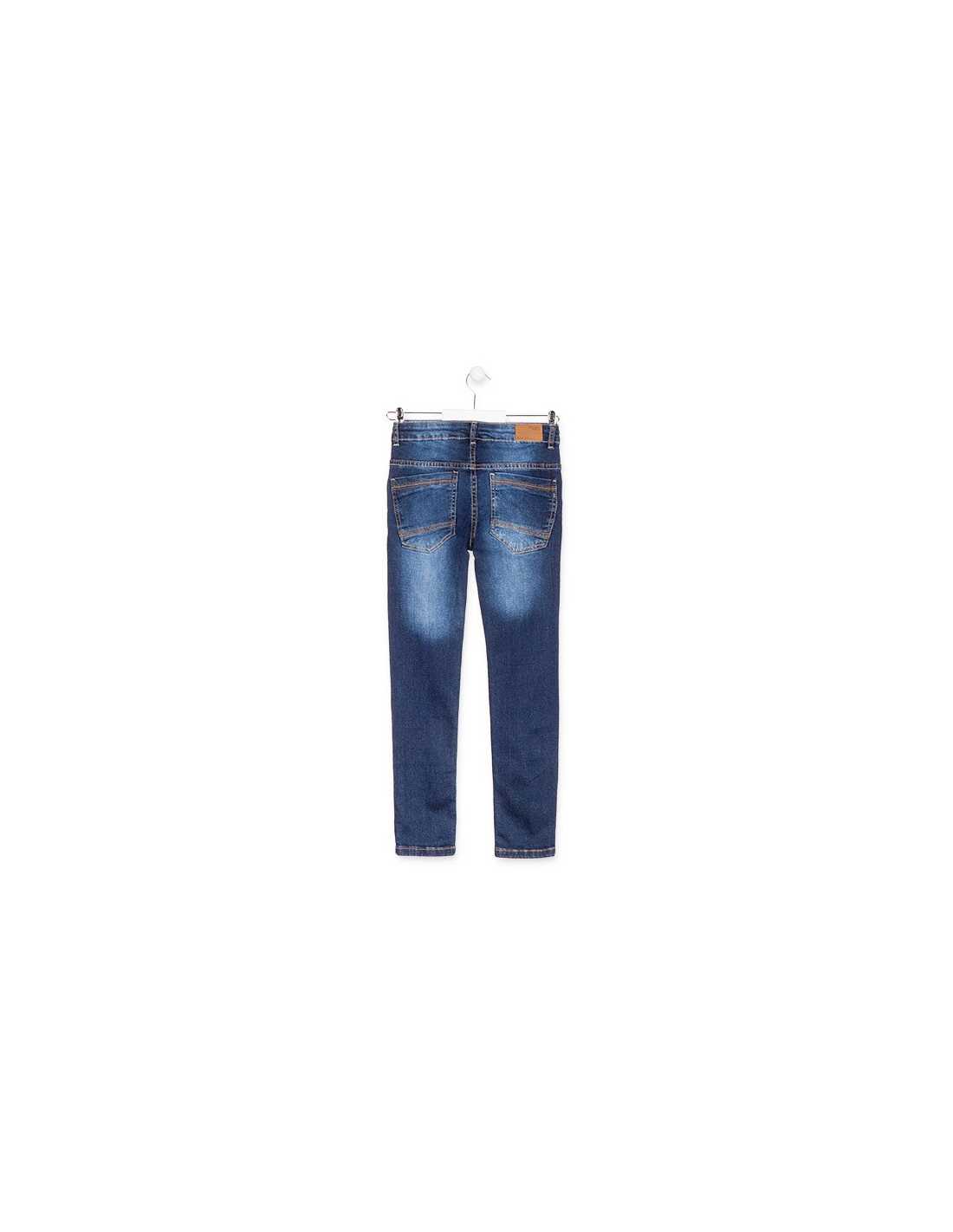 Pantalón vaquero patrón pitillo de la colección esencial para chico. Pantalón con abertura con botón de gancho metálico personalizado de marca Losan. Pespuntes en dos colores. Remaches en los bolsillos delanteros. Trabillas en la cintura y ajustador interior de goma con botón. Etiqueta imitación cuero en la cintura de la espalda. Disponible en otras tallas y colores.