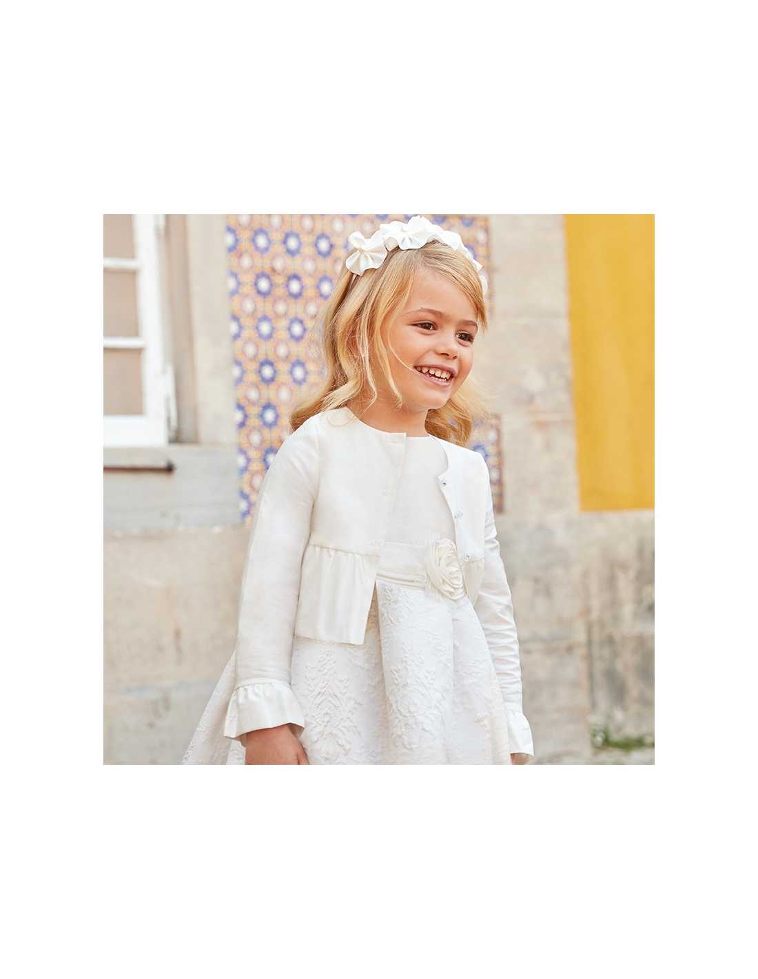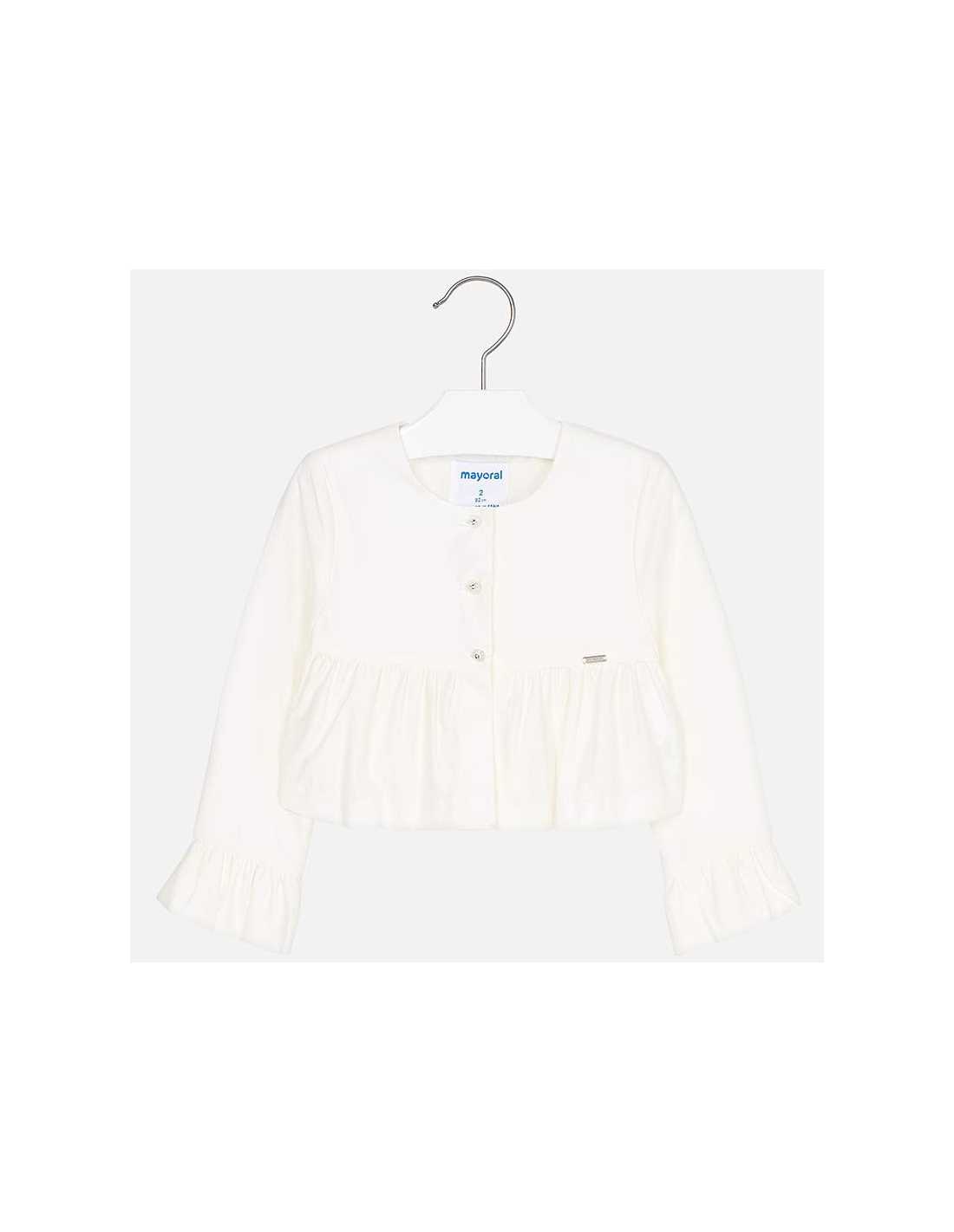 Chaqueta de manga larga para niña. Cuello redondo. Cierre con botones en la parte delantera. Elegante tejido para los momentos más especiales. Diseño con volantes decorativos en el bajo de la prenda.