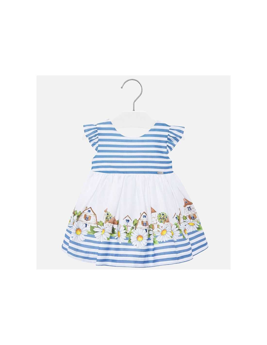 Vestido sin mangas para bebé niña. Cuello redondo. Cierre con un único botón y con cremallera trasera invisible. Suave tejido de algodón elástico. Modelo con rizo y volantes. Elementos de adorno: aplique de lazo. Diseño estampado.