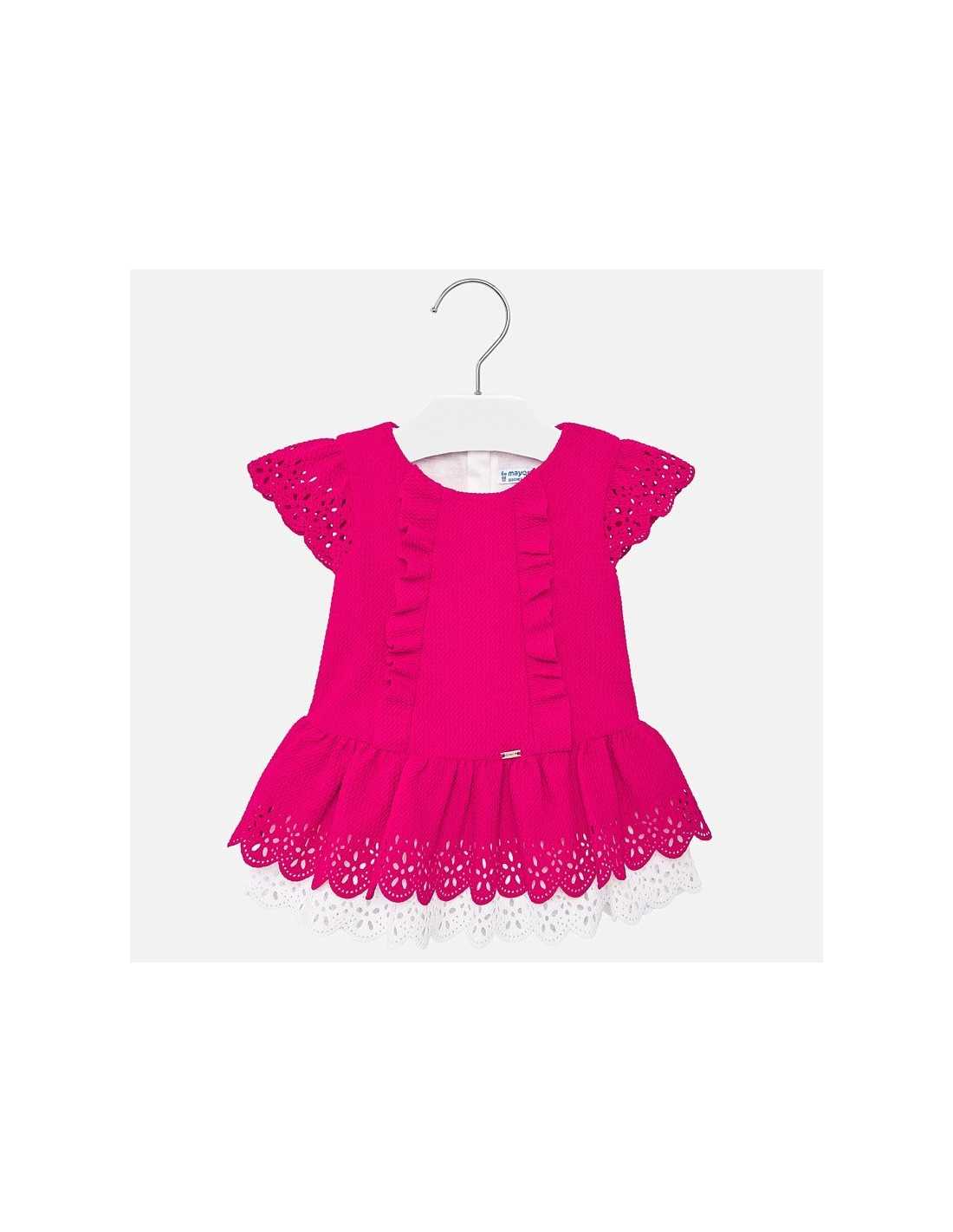 Vestido de manga corta para bebé niña con detalles de volantes. Cuello redondo. Diseño con corte a la cadera. Cierre con cremallera trasera invisible. Cómodo tejido de punto. Forro interior de color a contraste. Modelo con volantes. Diseño con terminaciones en ondas. Elementos de adorno: cintas bordadas.
