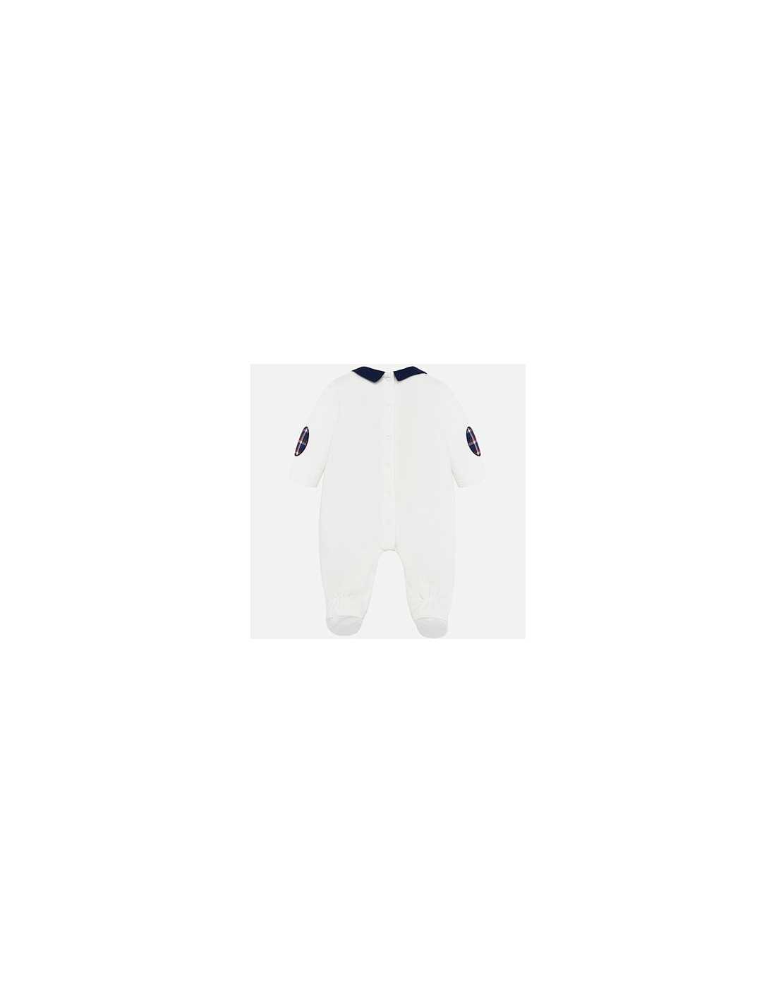 Pijama de manga larga para bebé niño recién nacido. Diseño con pies. Cuello de polo con detalles en distinto color. Cierre con botones a presión. Cálido tejido de algodón con tacto suave y aterciopelado. Elementos de adorno: modelo con coderas, dibujos decorativos. Las tallas mayores de este modelo presentan una suela antideslizante.