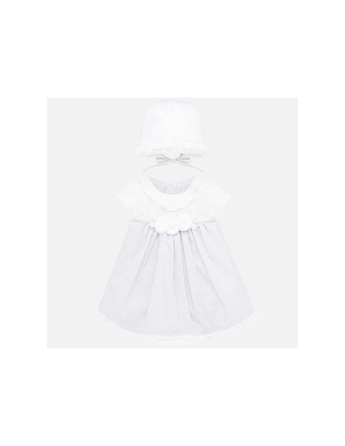 Clásico conjunto de tres piezas para bebé niña recién nacida formado por un precioso vestido con braguitas y capota a juego. 100% algodón.