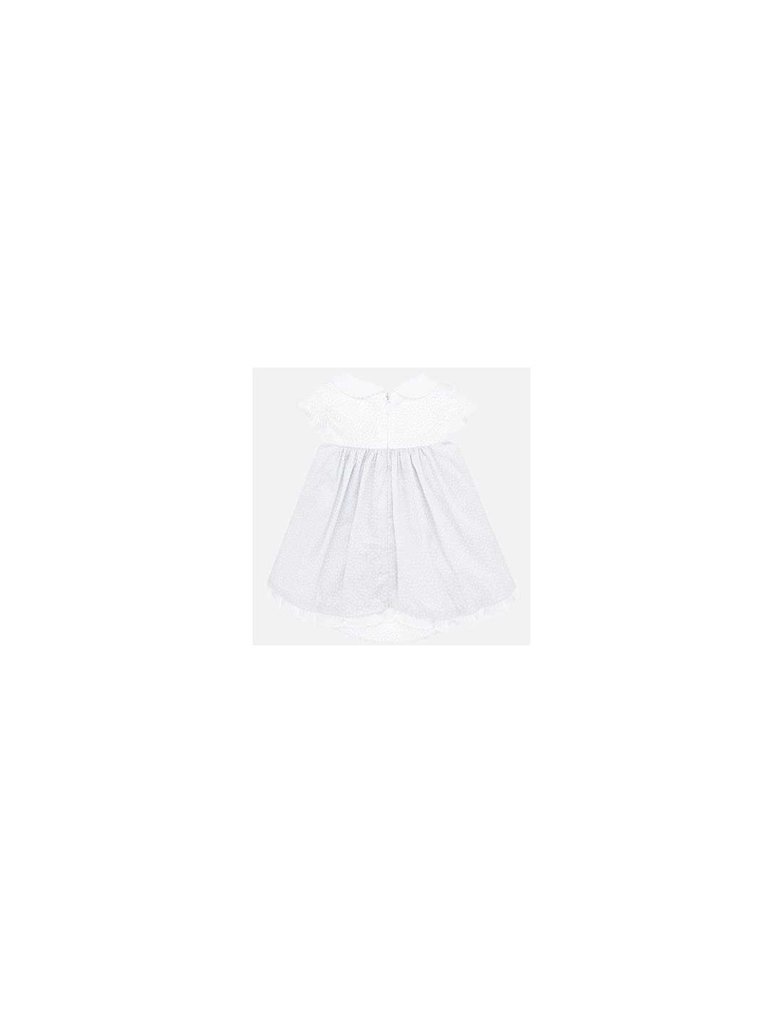 Clásico conjunto de tres piezas para bebé niña recién nacida formado por un precioso vestido con braguitas y capota a juego. Tejido 100% algodón.