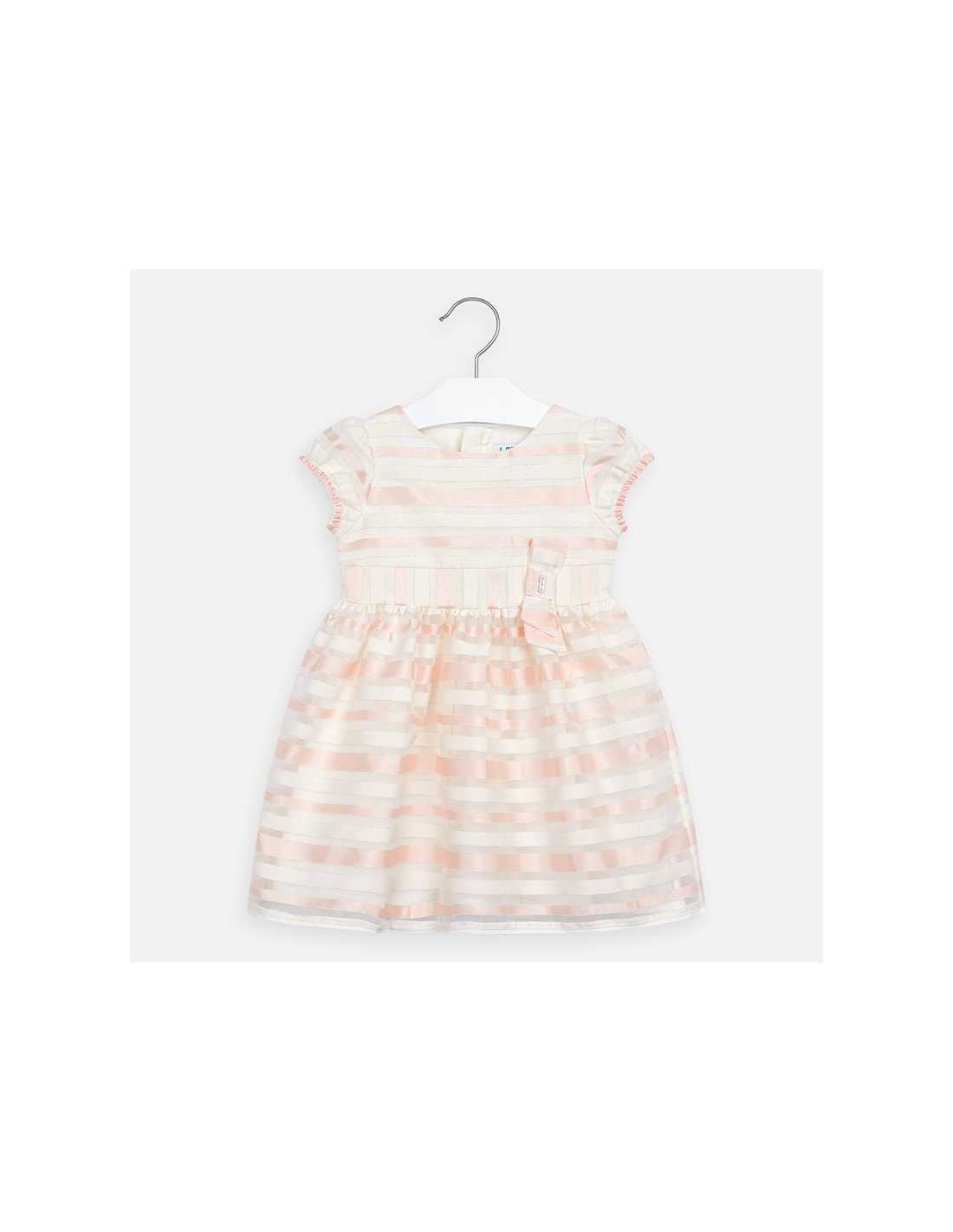 Vestido de manga corta para niña. Cuello redondo. Cierre con cremallera trasera invisible. Tejido fluido y elástico para una máxima comodidad en el día a día. Modelo con rizo. Elementos de adorno: lazada decorativa. Motivo de rayas.