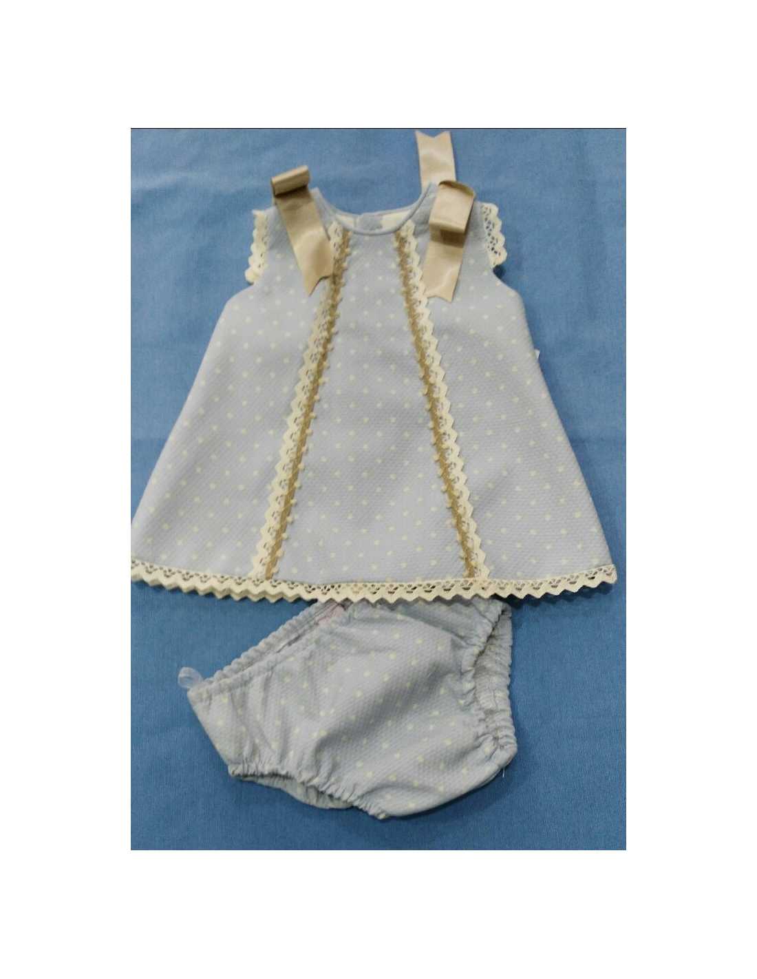 Vestido sin mangas para bebé niña recién nacido . Cierre con botones a presión. Tejido de aspecto fresco y actual con pique estampado. Elementos de adorno:Lazos decorativos, puntilla y tira bordada