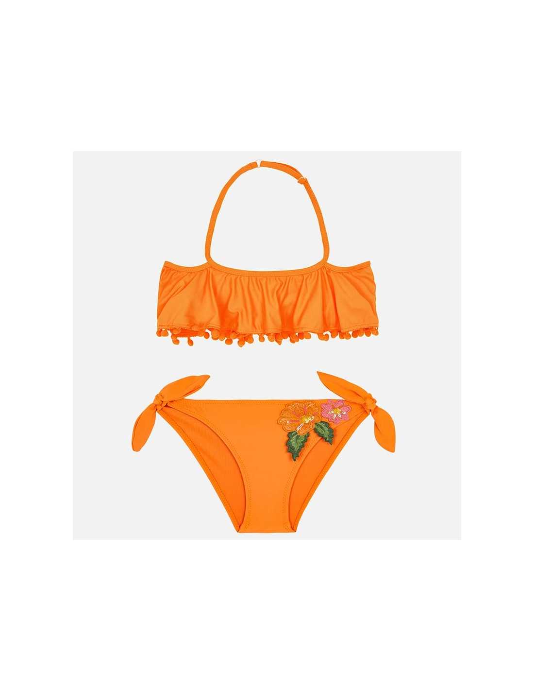 Bikini de dos piezas combinadas para niña, perfecto para crear un outfit de baño divertido y con estilo. Tejido elástico y adaptable al cuerpo para una máxima comodidad. Elementos de adorno: apliques florales, borlas, apliques de lazos, volante decorativo.Bikini volantes con apliques niña