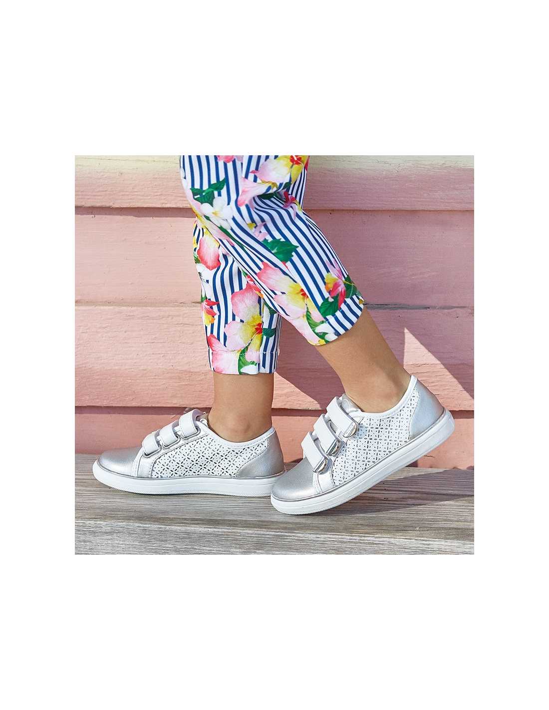 Zapatillas de estilo casual para niña, combinables y versátiles. Calzado con forro interior y plantilla de algodón transpirable. Revestimiento exterior combinado de piel y materiales a contraste. Suela de goma antideslizante para afianzar la pisada. Cierre ajustable con triple velcro que permite un calce fácil, práctico y regulable. Elementos de adorno: motivos calados, detalles metalizados. Este modelo también está disponible en tallas 31 a 35 (Art. 45011) de la colección de Mini y en las tallas 36 a 38 (Art. 47011) de la colección de Junior.