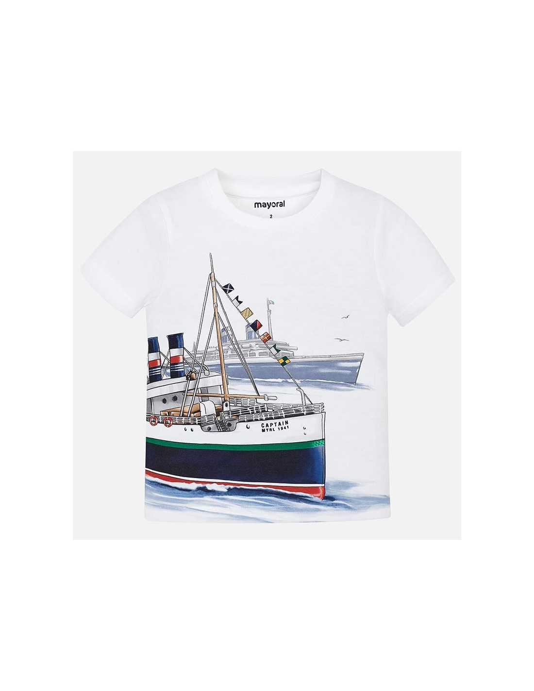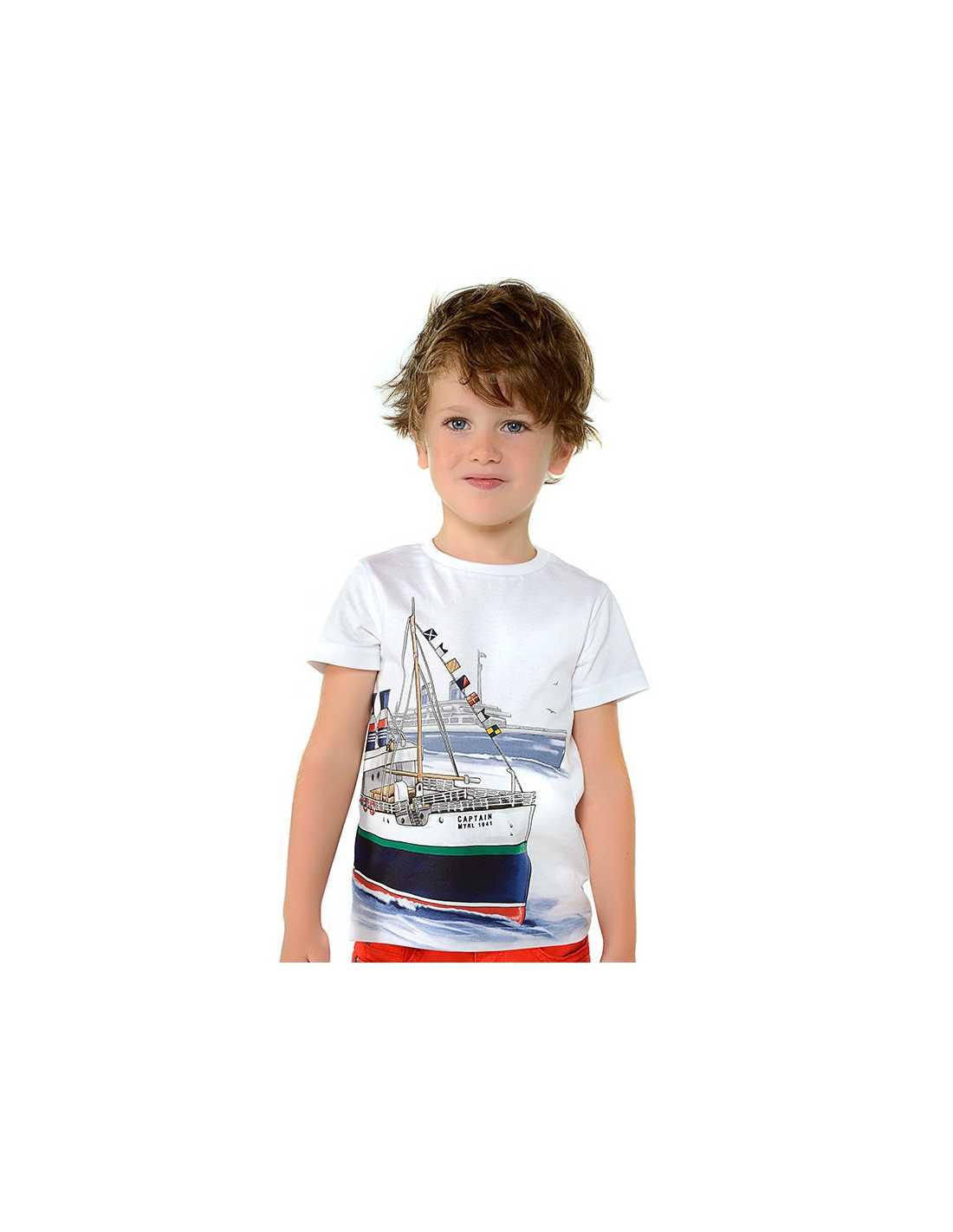 Camiseta de manga corta para chico. Cuello redondo. Tejido 100% algodón. Elementos de adorno: dibujo en la parte delantera.
