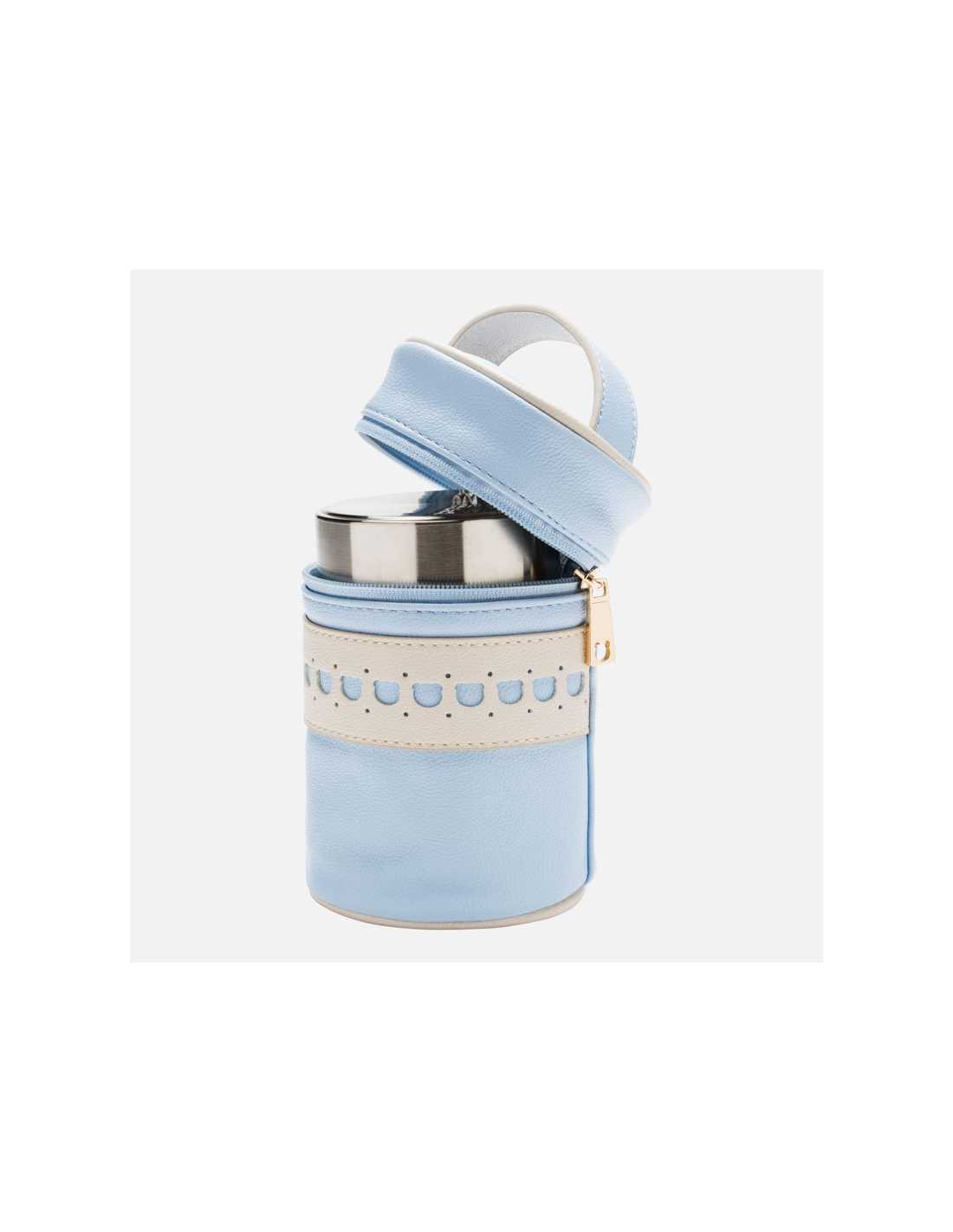 Cómoda portapapilla para bebé, realizada en polipiel con diseño combinado, con una tira troquelada en diferente tono. Va forrada en su interior con un tejido térmico en plata. Este tejido permitirá conservar la papilla en su temperatura ideal, ya sea fría o caliente.