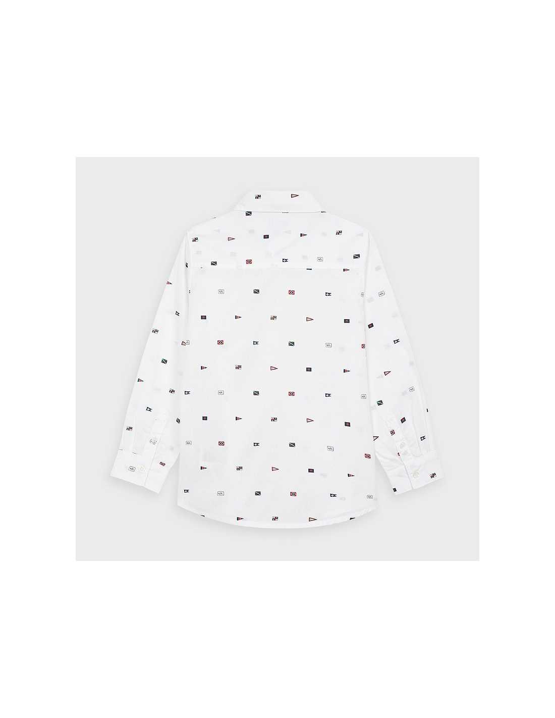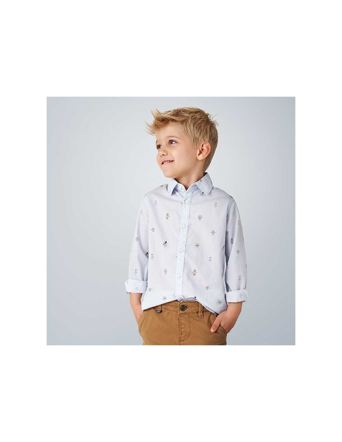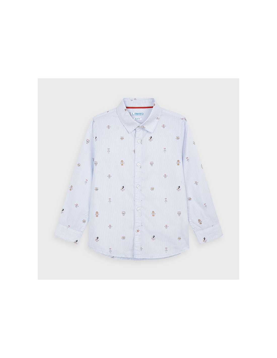 Camisa de manga larga para niño de 2 a 9 años, con puños abotonados. Cuello camisero. Línea de corte entallado (Slim Fit). Cierre con botones en la parte delantera. Tejido 100% algodón. Estampado con bicicletas.