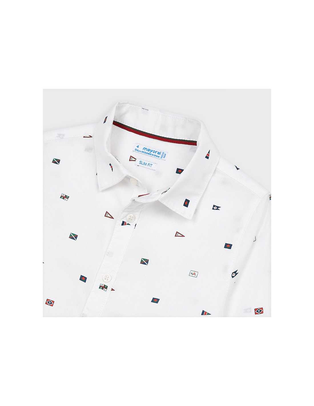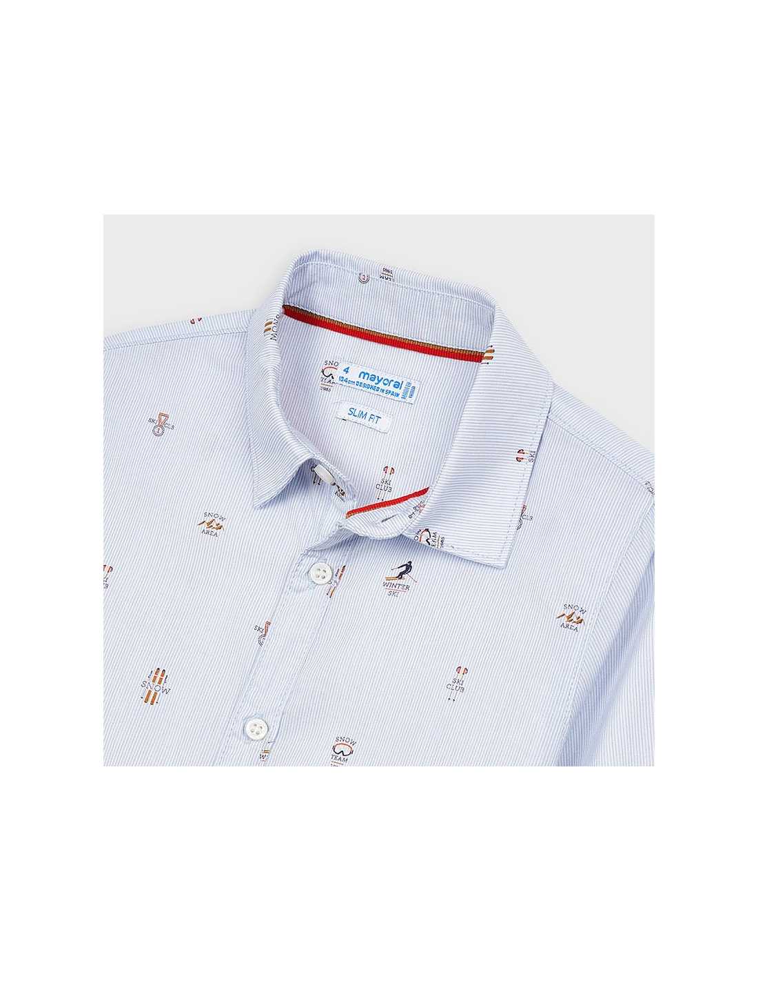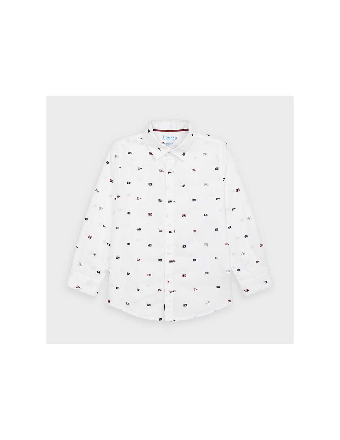 Camisa de manga larga para niño de 2 a 9 años, con puños abotonados. Cuello camisero. Línea de corte entallado (Slim Fit). Cierre con botones en la parte delantera. Tejido 100% algodón. Estampado con bicicletas.