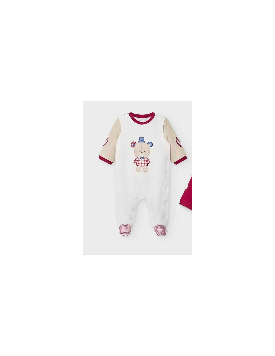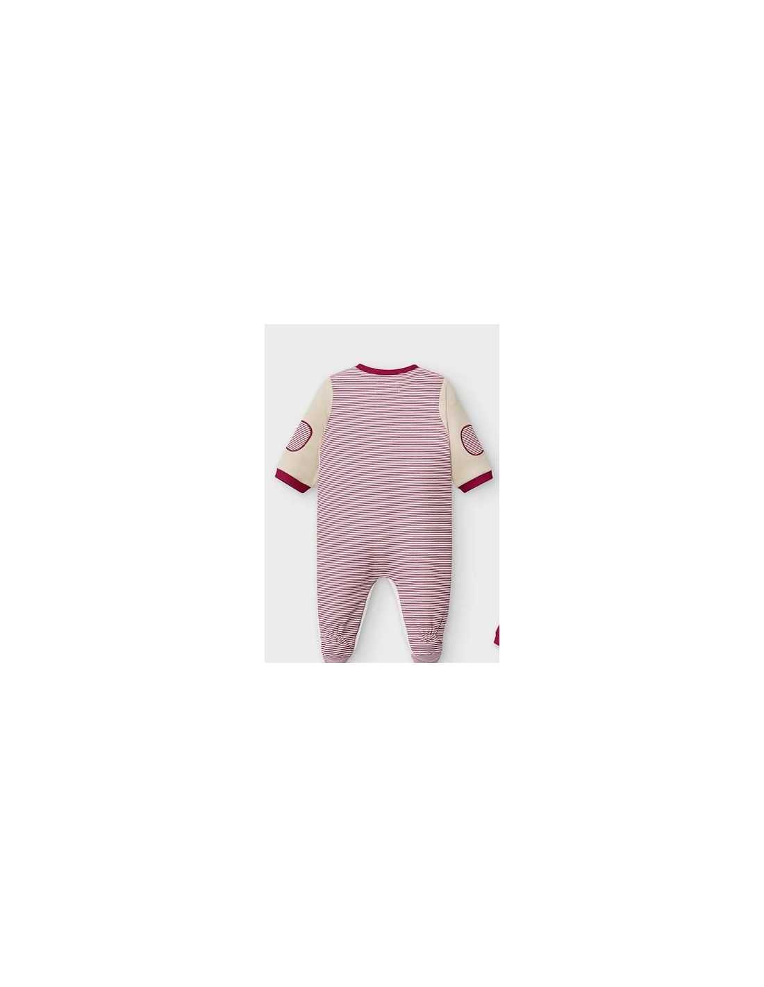 Pijama de manga larga para recién nacido niño. Cuello redondo en distinto color. Cierre con botón a presión en la parte delantera. Suave tejido de algodón elástico. Elementos de adorno: aplique de orejitas, bordados en la parte delantera, modelo con coderas.