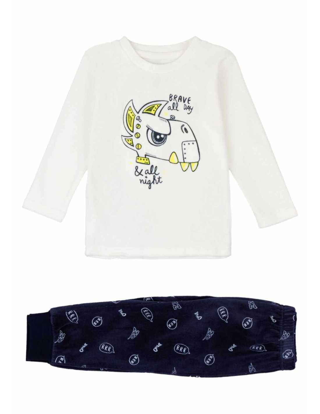 Pijama de dinosaurios para niño. Pijama en tejido de terciopelo con camiseta de manga larga y cuello redondo. Con estampado en el delantero. Y pantalón todo estampado con puño en el bajo. Disponible en varios colores. Presentado en bolsa de tela.