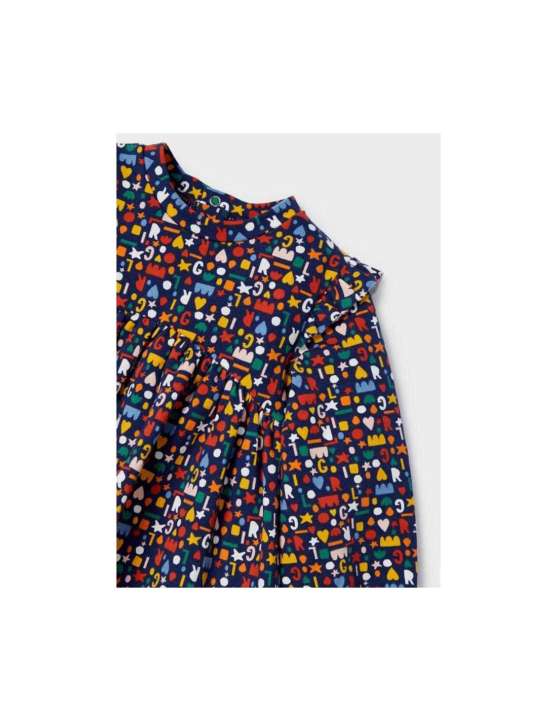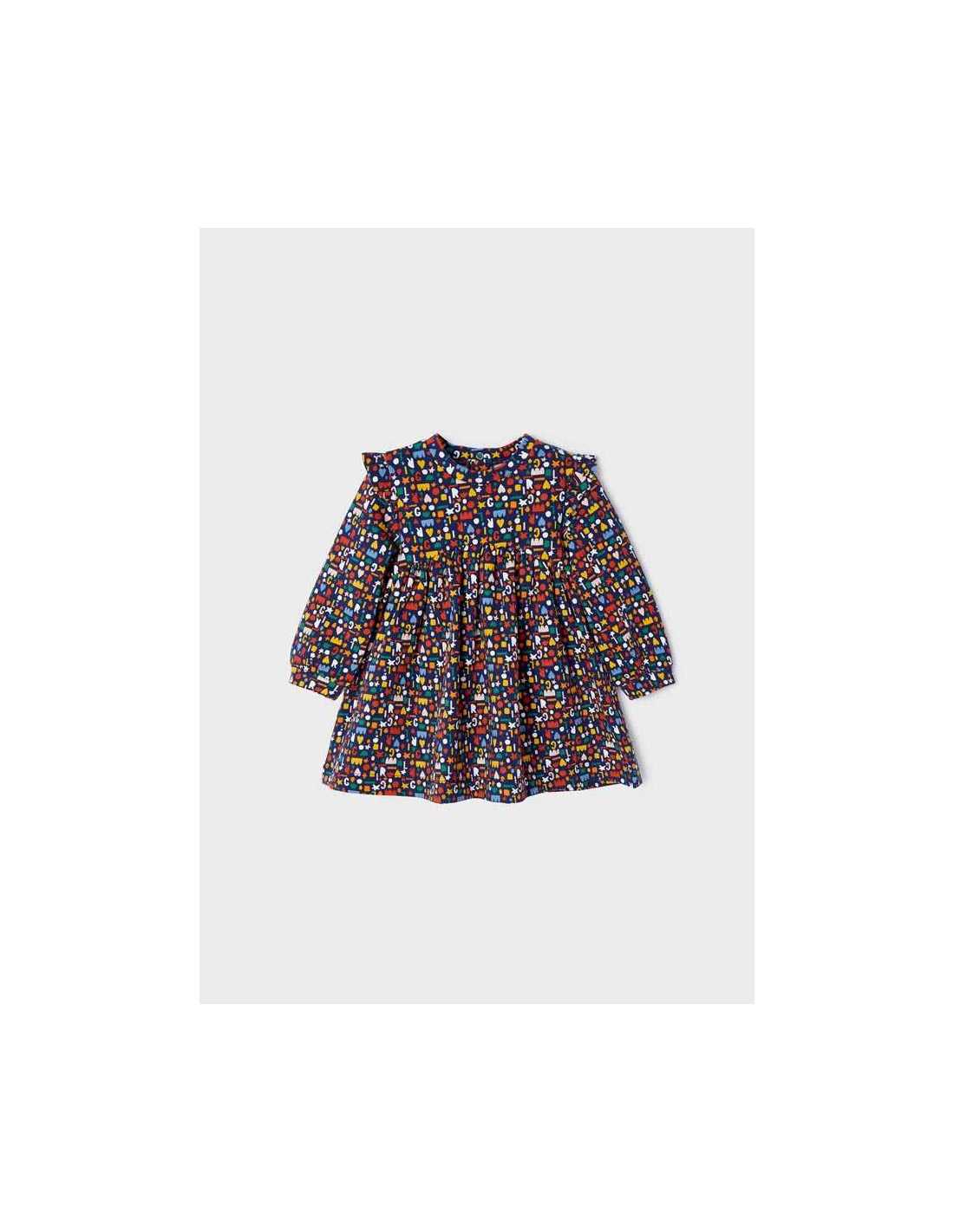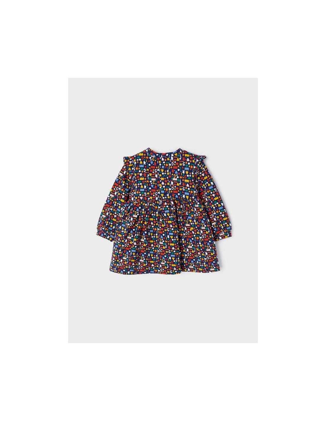 Vestido de manga larga para bebé. Cierre con botones a presión en la parte posterior para facilitar la puesta de la prenda.