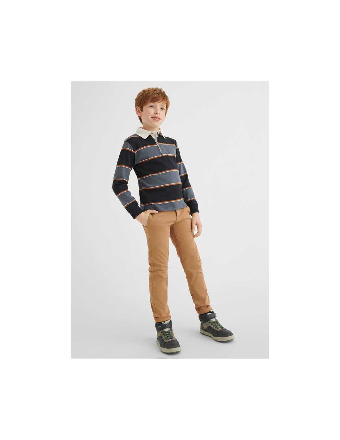 Prenda ECOFRIENDS, contiene algodón sostenible. Pantalón largo para chico de corte ajustado (Slim fit) que se adapta a la silueta. Cierre con cremallera y botón.