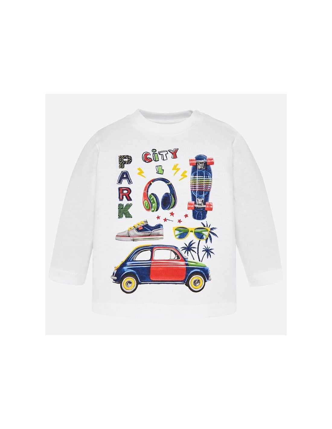 Camiseta de manga larga para bebé niño. Cuello redondo. Cierre con botones a presión en el hombro para facilitar la puesta de la prenda. Tejido 100% algodón. Elementos de adorno: dibujo en la parte delantera.