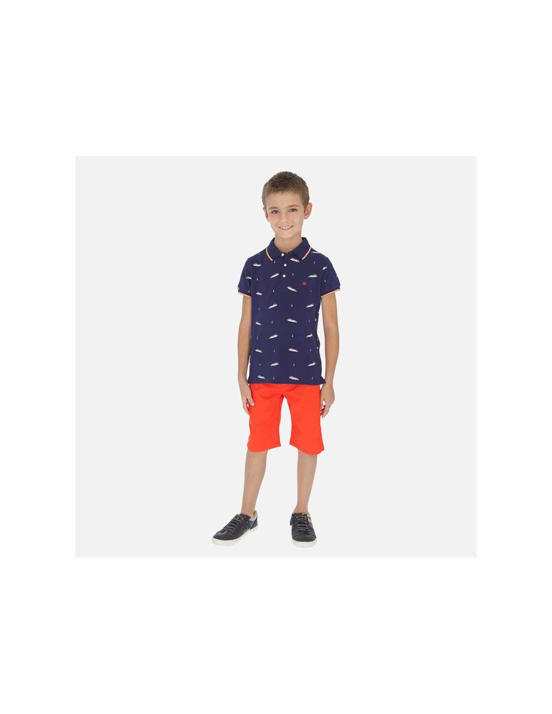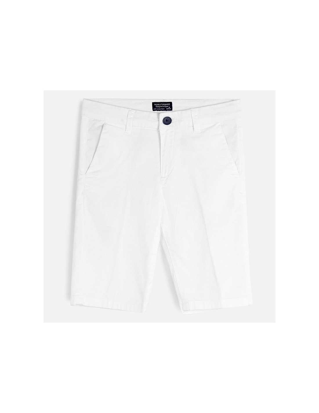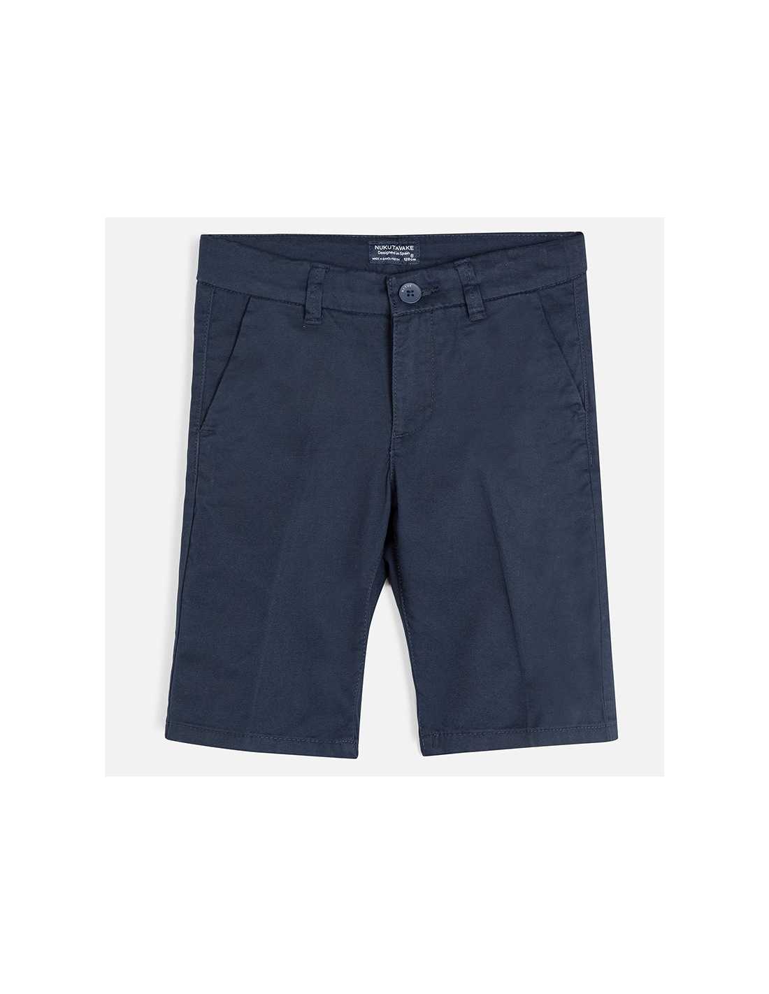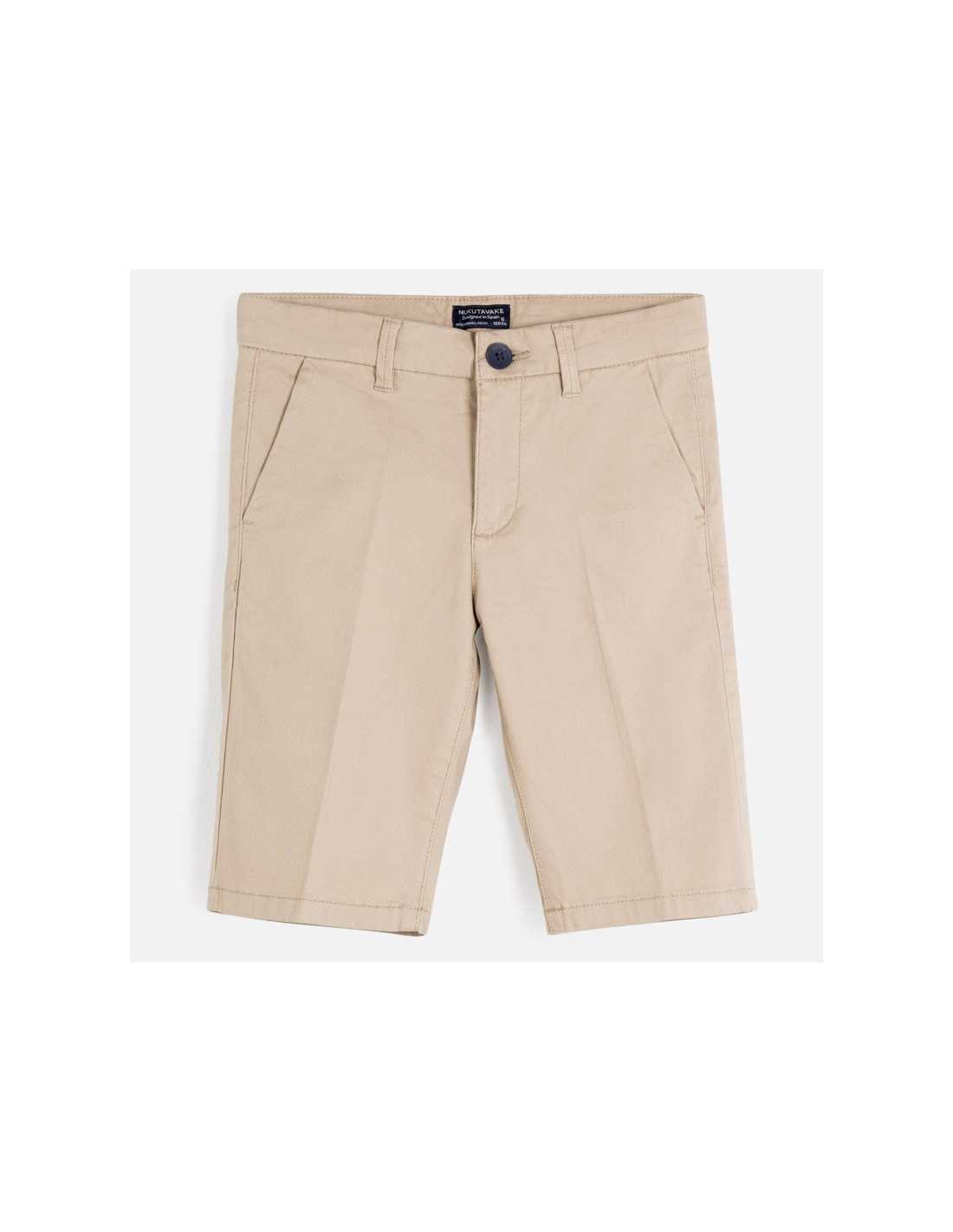 Pantalón corto de tipo bermuda para chico. Cintura con goma elástica y cierre con cremallera y botón. Cómodo tejido de sarga de gran resistencia. Diseño con múltiples bolsillos. Diseño liso.