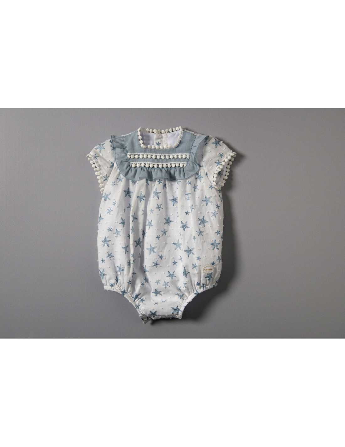 Una monada de ranita de bebe el tejido plumeti blanco con estampado de estrellas verde agua del mismo tono del canesú, que incluye borlas blanca. Es de manga corta y con cuello de caja.