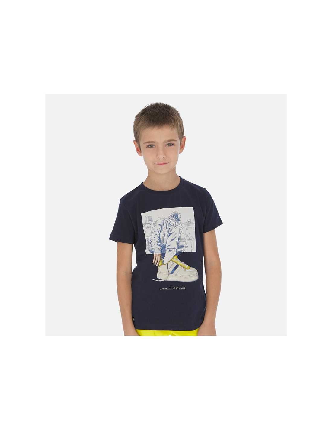 Camiseta de manga corta para chico. Cuello redondo. Suave tejido de algodón elástico. Elementos de adorno: dibujo en la parte delantera.