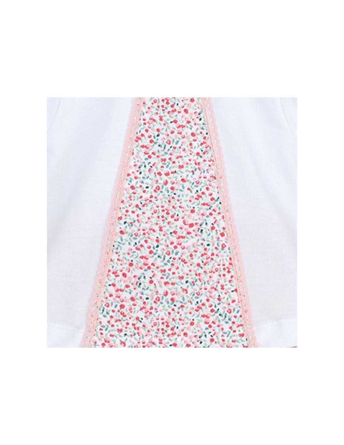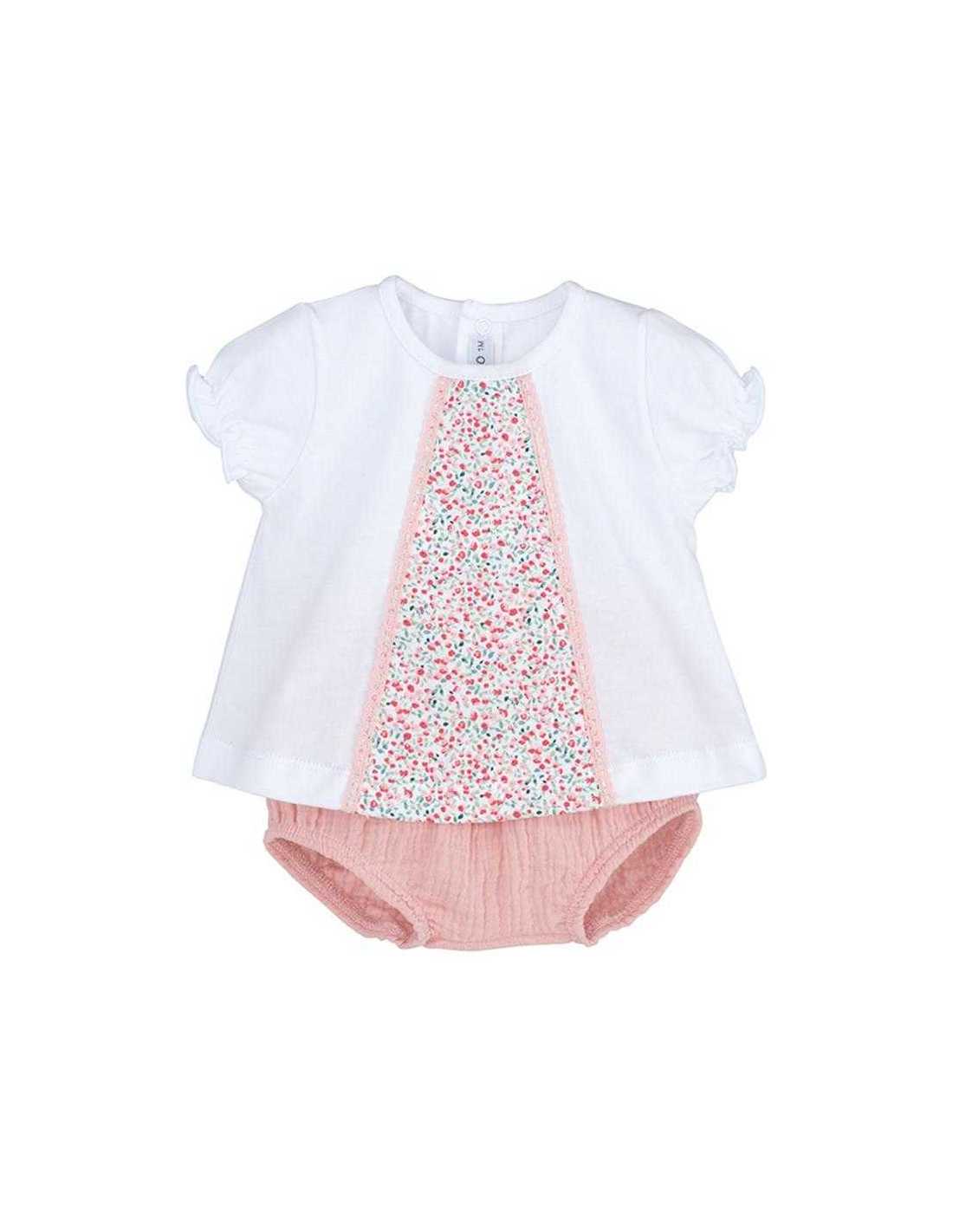 Conjunto de primera puesta para bebe niña compuesto por camiseta de manga corta blanca con con flores y braguita.