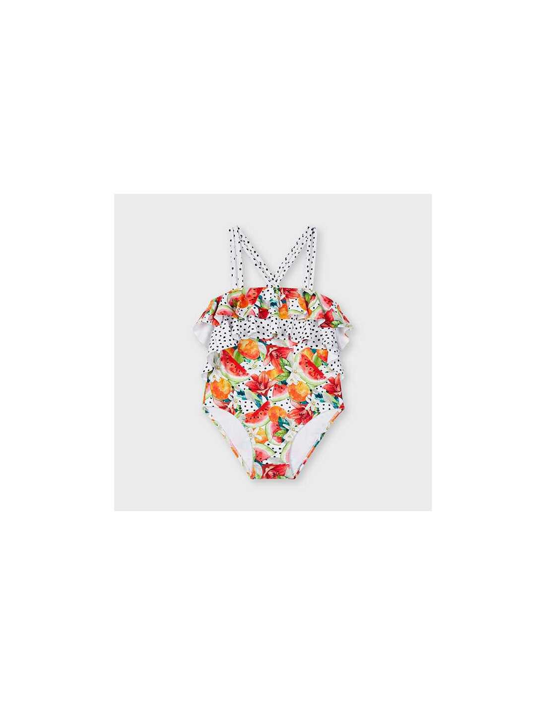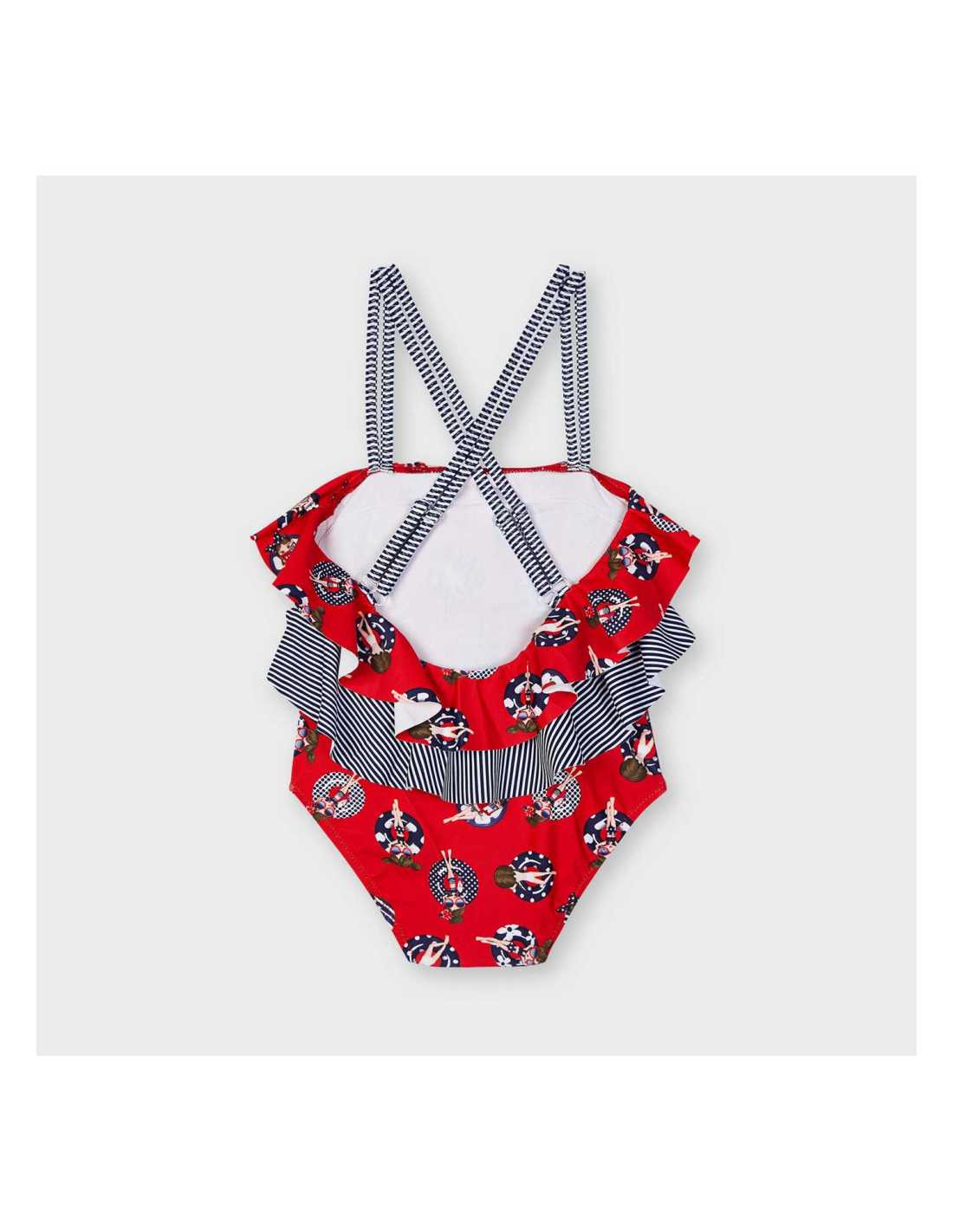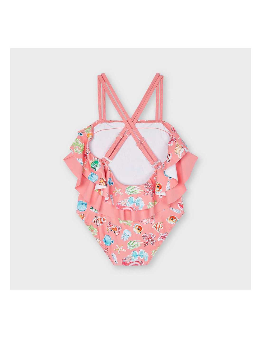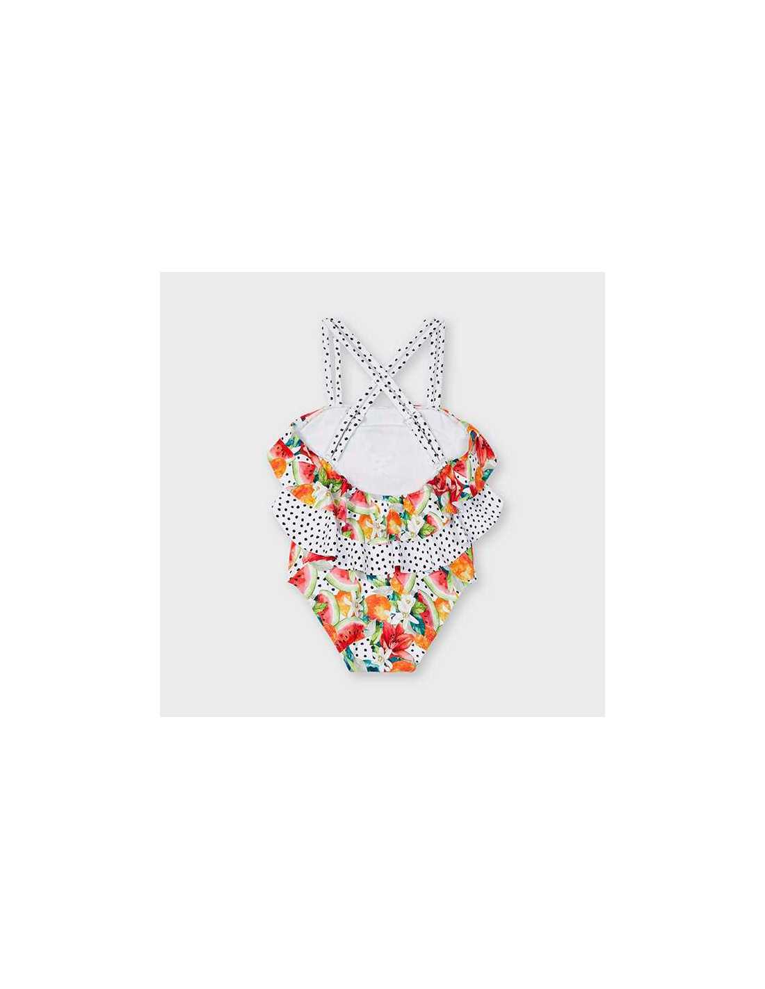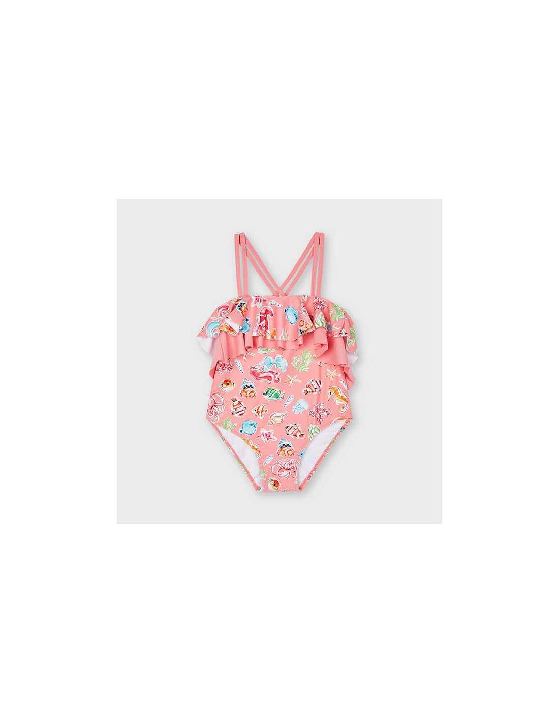 Bañador de tirantes para niña de 2 a 9 años con espalda cruzada. Tejido fluido y elástico para una máxima comodidad en el día a día. Elementos de adorno: volantes decorativos.