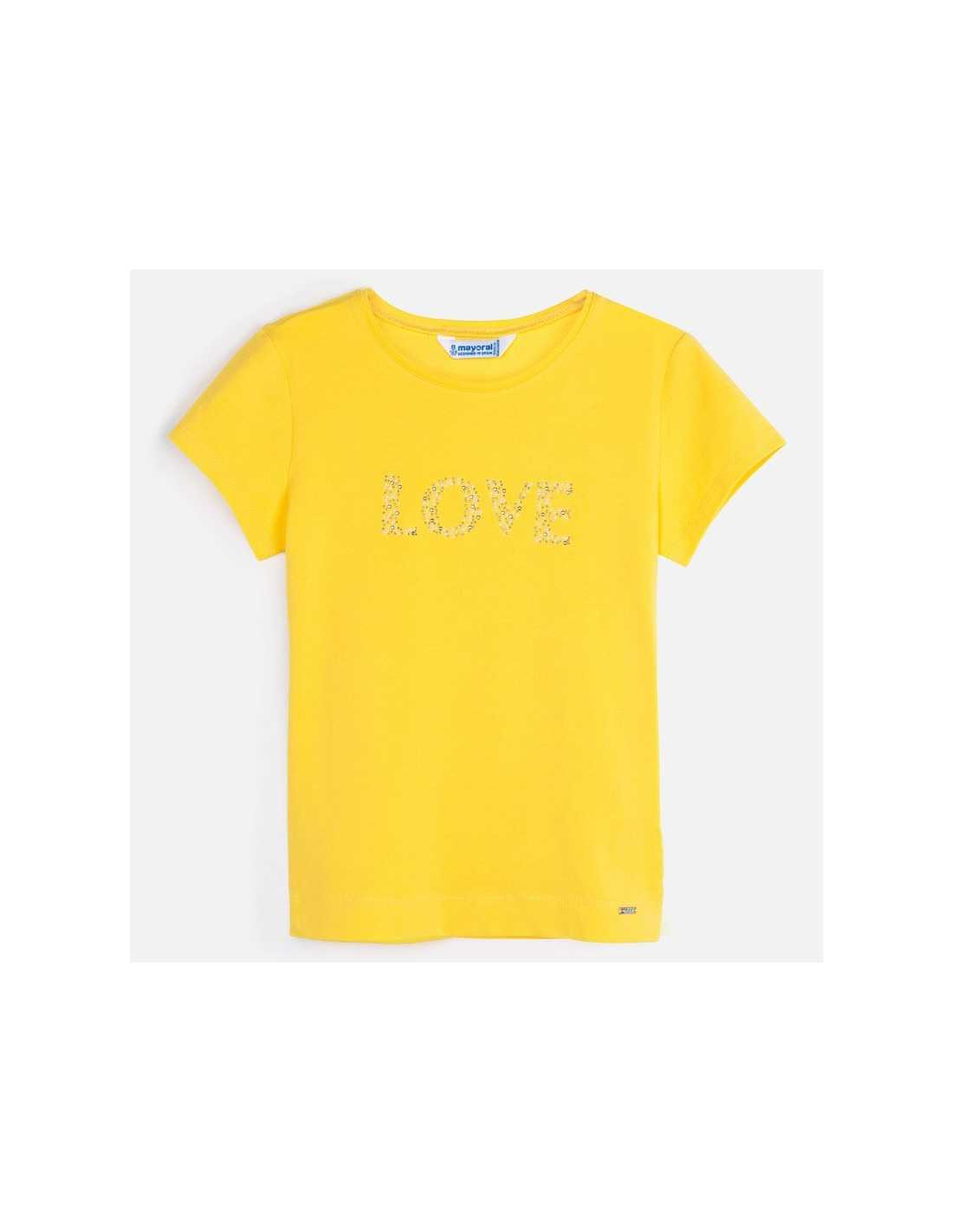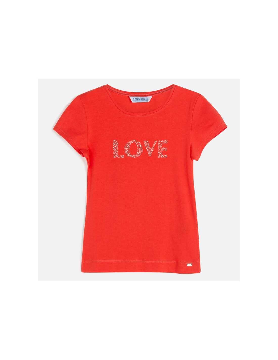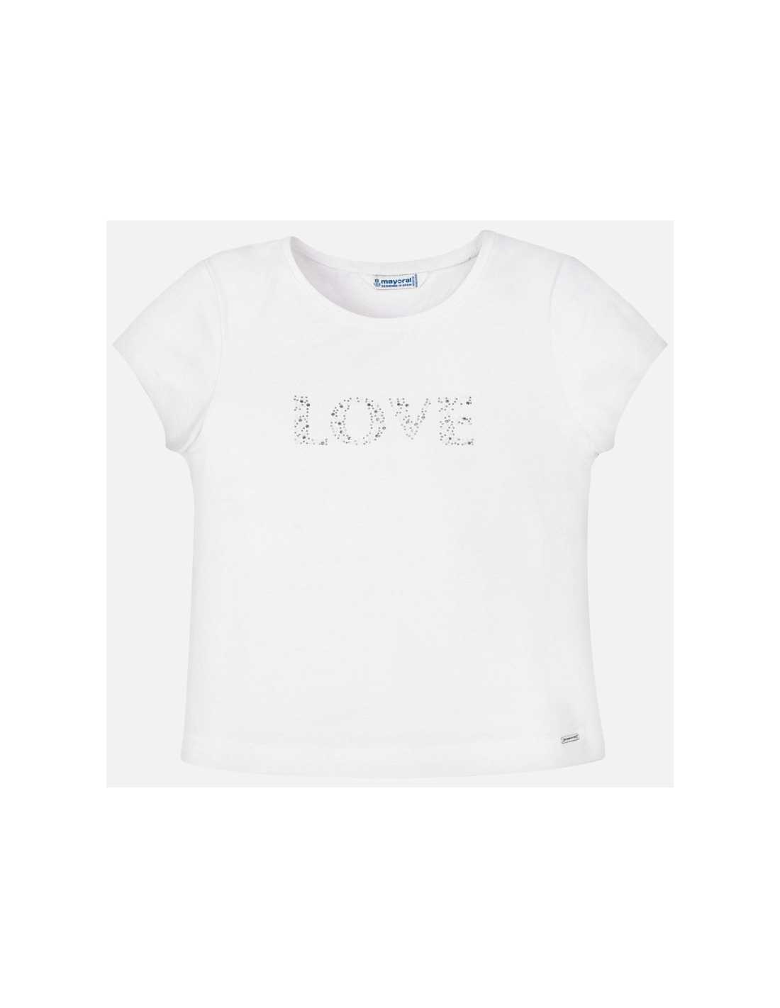 Camiseta de manga corta para chica. Cuello redondo. Modelo de nuestra colección de prendas básicas con diseño clásico, ideales para completar cualquier conjunto. Suave tejido de algodón elástico. Elementos de adorno: strass, texto en el delantero de la prenda.