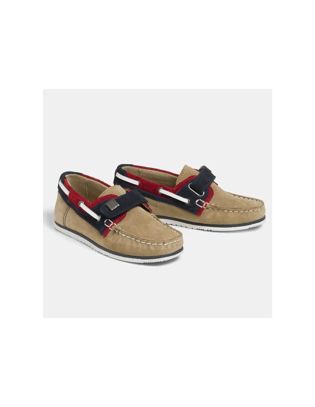 Zapatos de tipo náuticos para niño, de estilo versátil y combinable con todo tipo de looks. Calzado con forro interior de algodón y plantilla de piel. Revestimiento exterior de piel serraje. Suela de goma antideslizante para afianzar la pisada. Cierre con banda de velcro ajustable que garantiza una perfecta sujeción del pie.