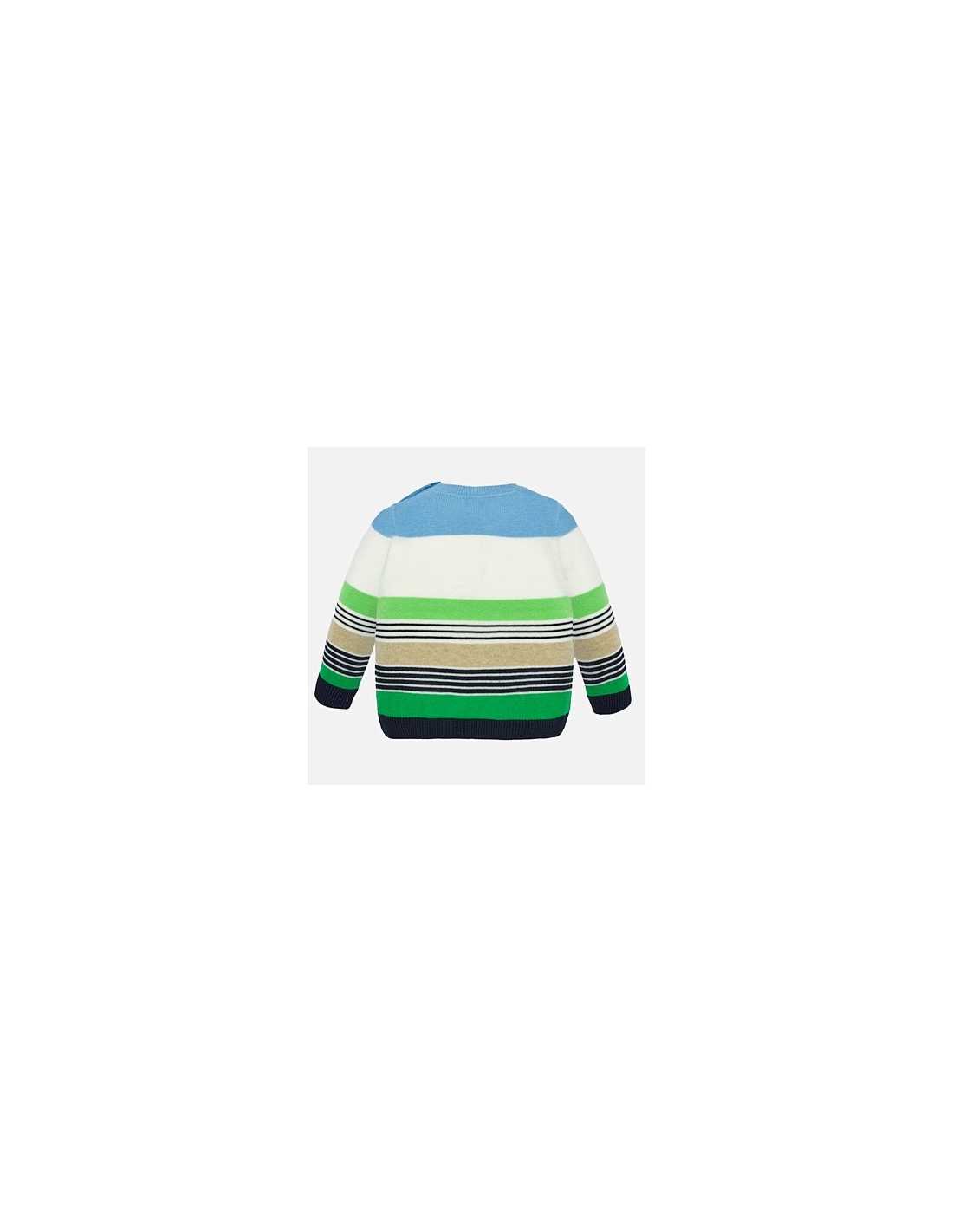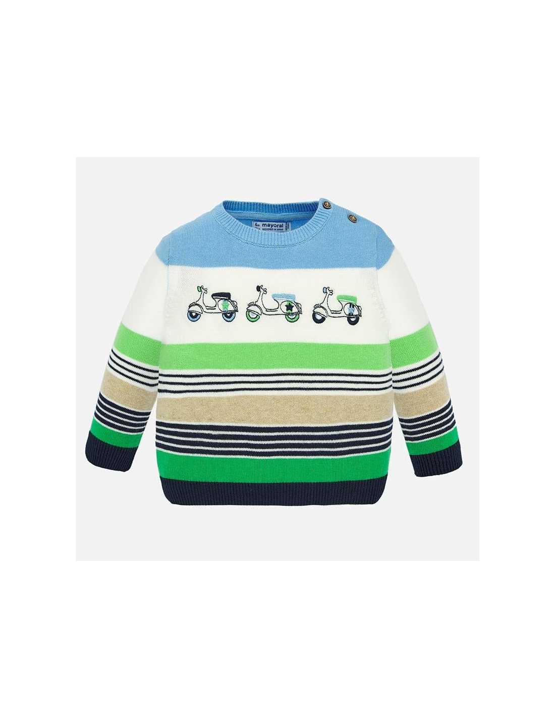 Jersey de manga larga para bebé niño. Cuello redondo. Cierre con botones en el hombro para facilitar la puesta de la prenda. Tejido de punto tricotosa fino de tacto suave y agradable. Elementos de adorno: dibujos decorativos. Motivo de rayas.