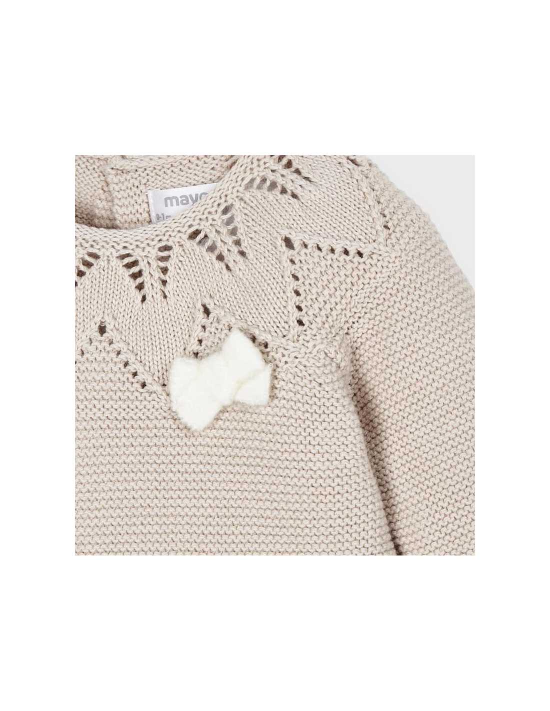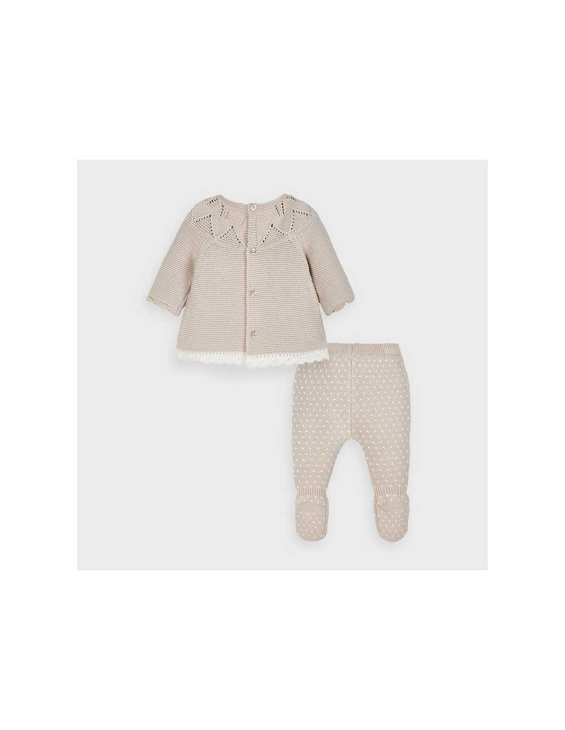 Conjunto polaina tricot para recién nacida niña de 0 a 18 meses. Cuello redondo. Cierre con botones en la espalda para facilitar la puesta de la prenda. Tejido 100% algodón. Elementos de adorno: aplique de lazo.