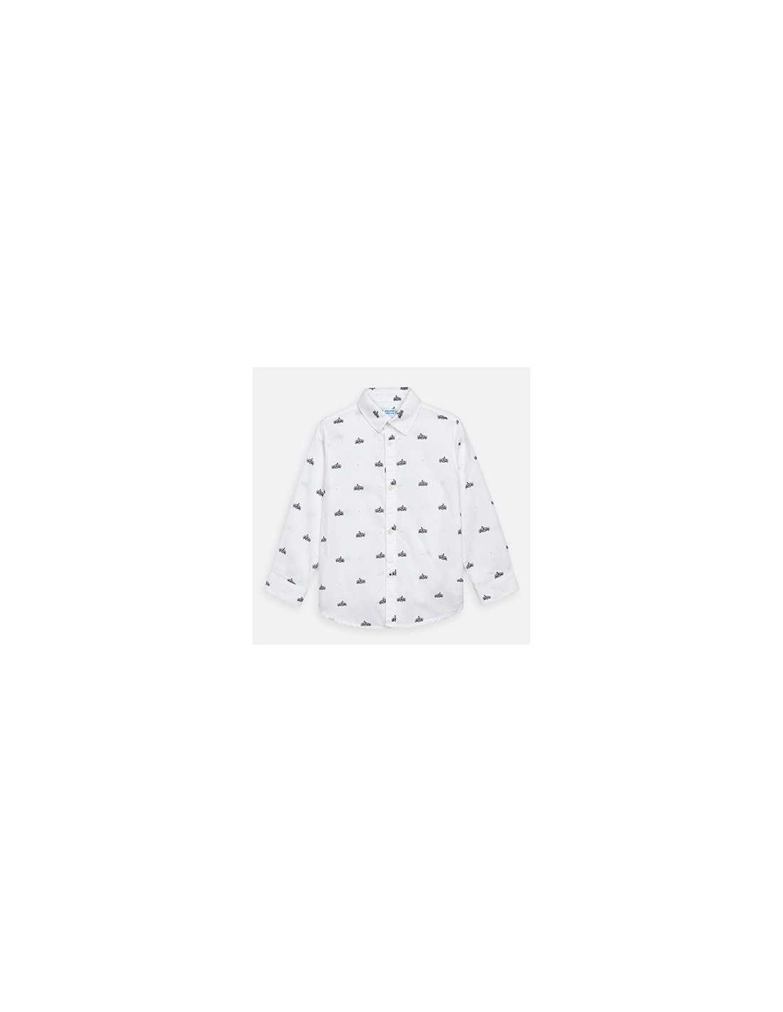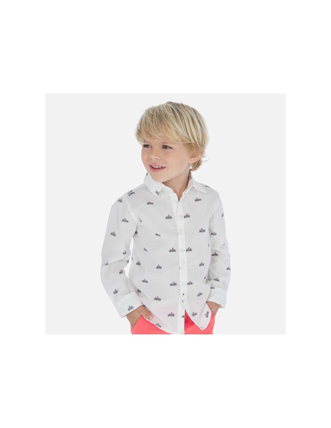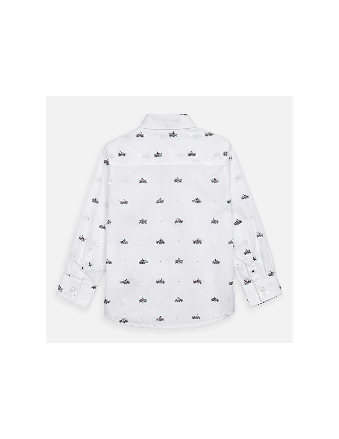 Camisa de manga larga para niño con puños abotonados. Cuello camisero. Cierre con botón a presión en la parte delantera. Cómodo tejido de popelín, duradero y de fácil cuidado. Diseño estampado.