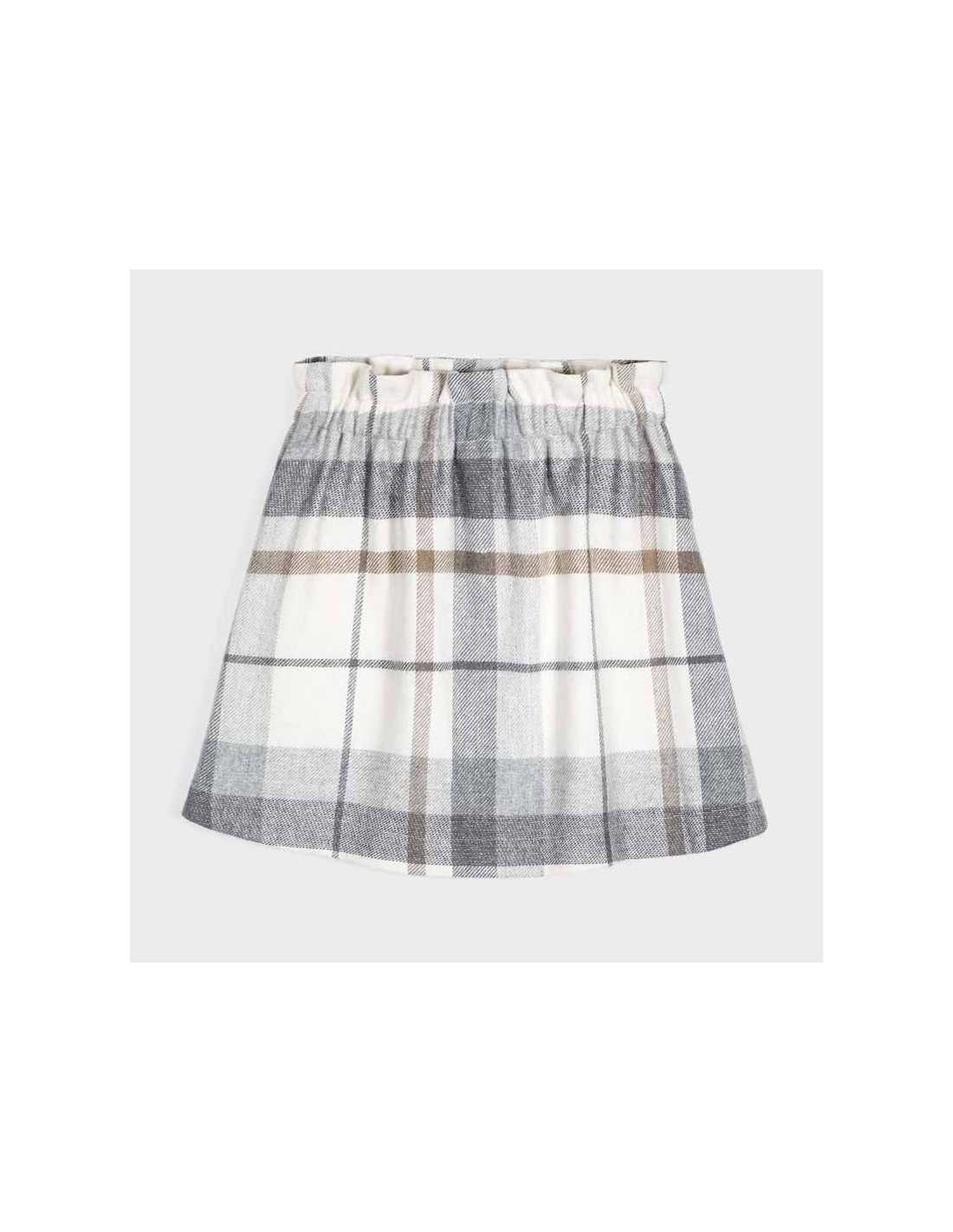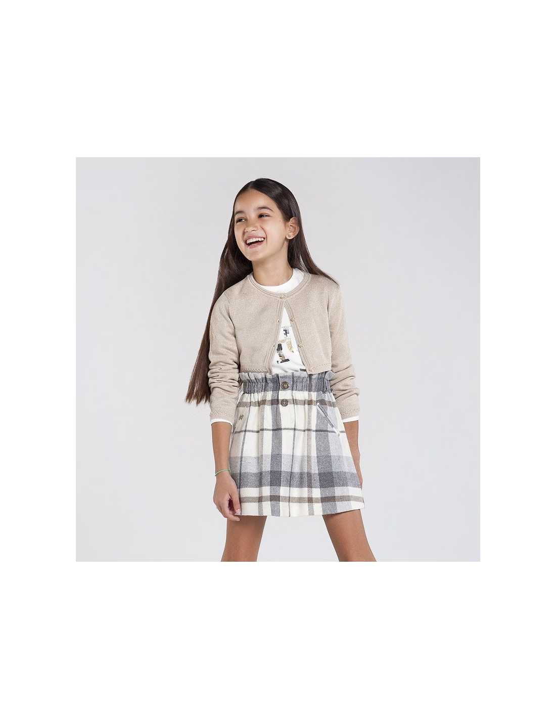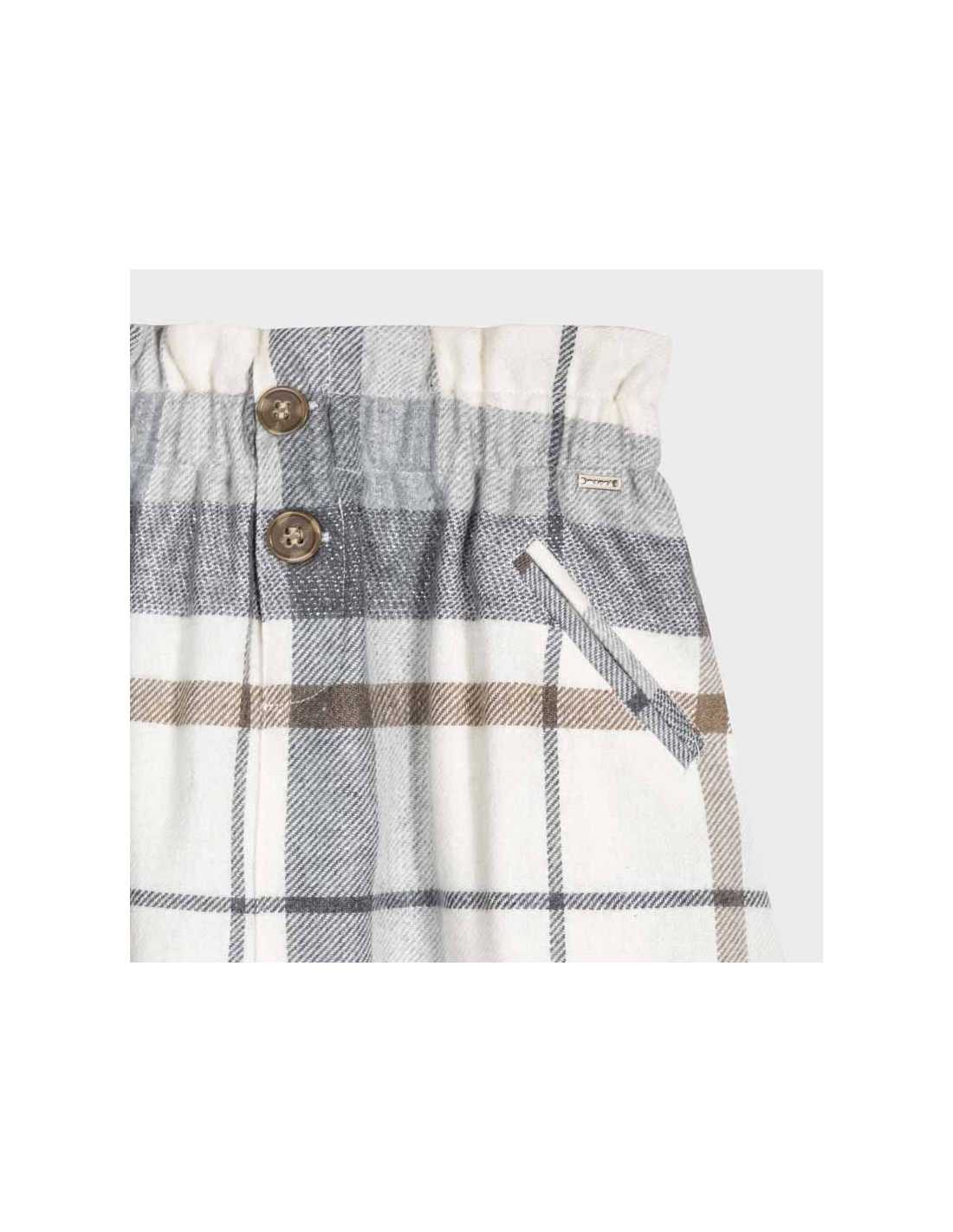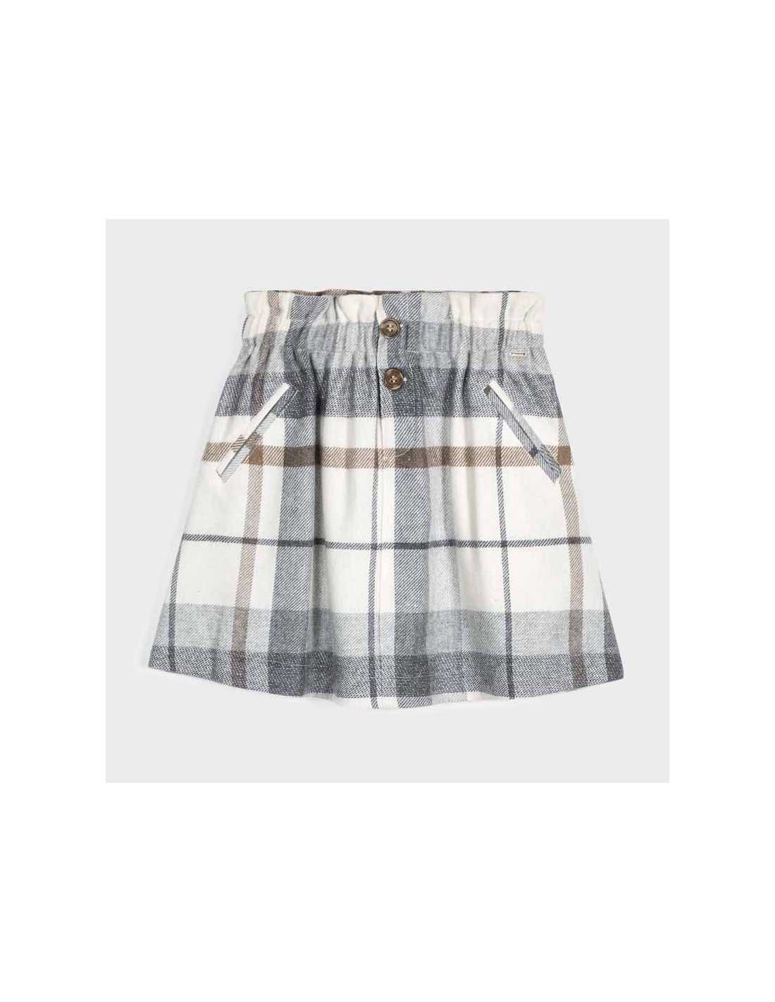 Falda corta para chica de 8 a 16 años. Goma elástica en la cintura para un mejor ajuste. Tejido fluido y elástico para una máxima comodidad en el día a día. Bolsillos delanteros decorativos simulados. Elementos de adorno: botones decorativos. Motivo de cuadros.