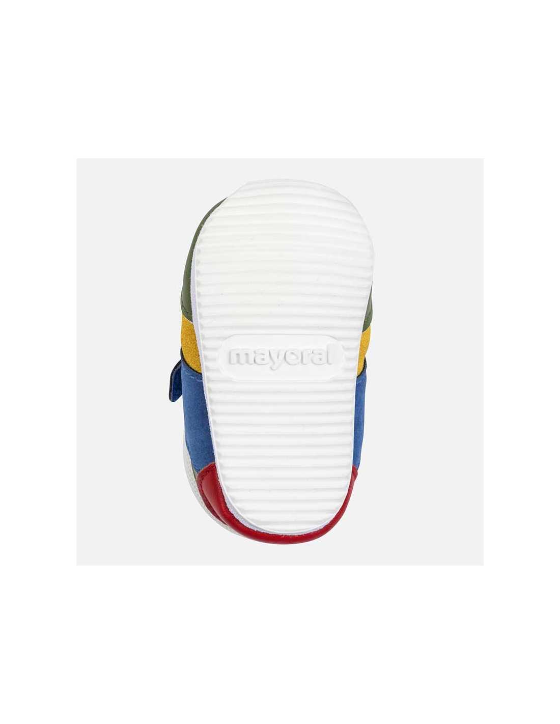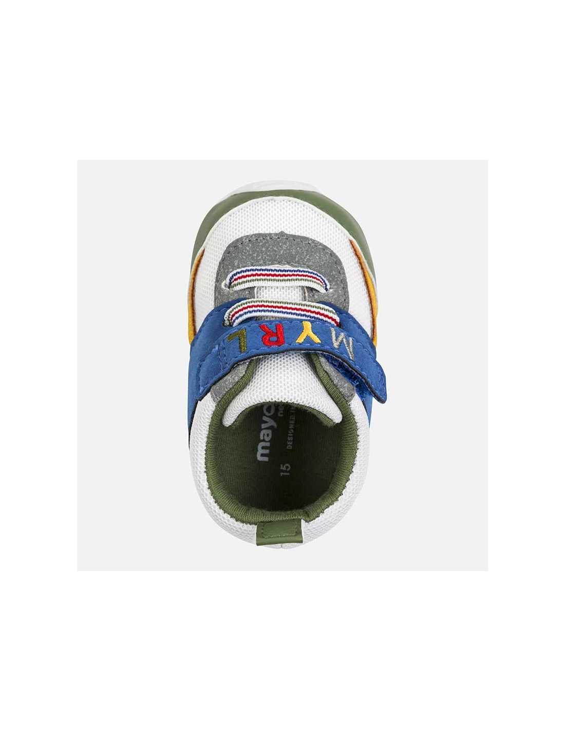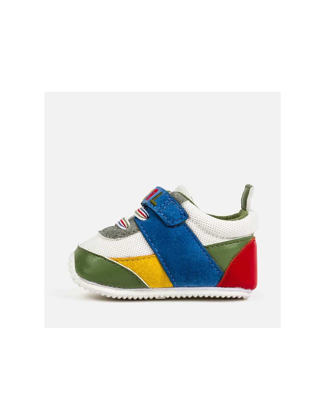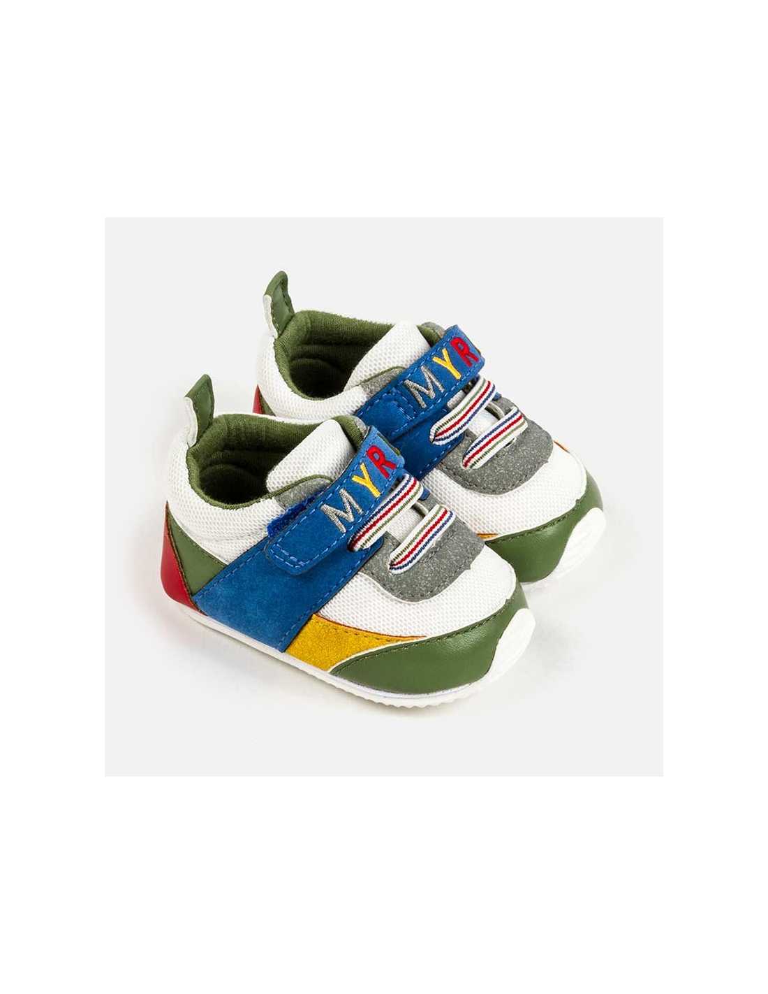Zapatillas deportivas para bebé niño recién nacido, de gran versatilidad para sus aventuras diarias. Revestimiento exterior de materiales combinados. Cierre con banda de velcro ajustable que garantiza una perfecta sujeción del pie. Elementos de adorno: bordado, cordones elásticos decorativos. Este artículo se presenta en una caja de la línea Newborn ideal para regalar en ocasiones especiales.