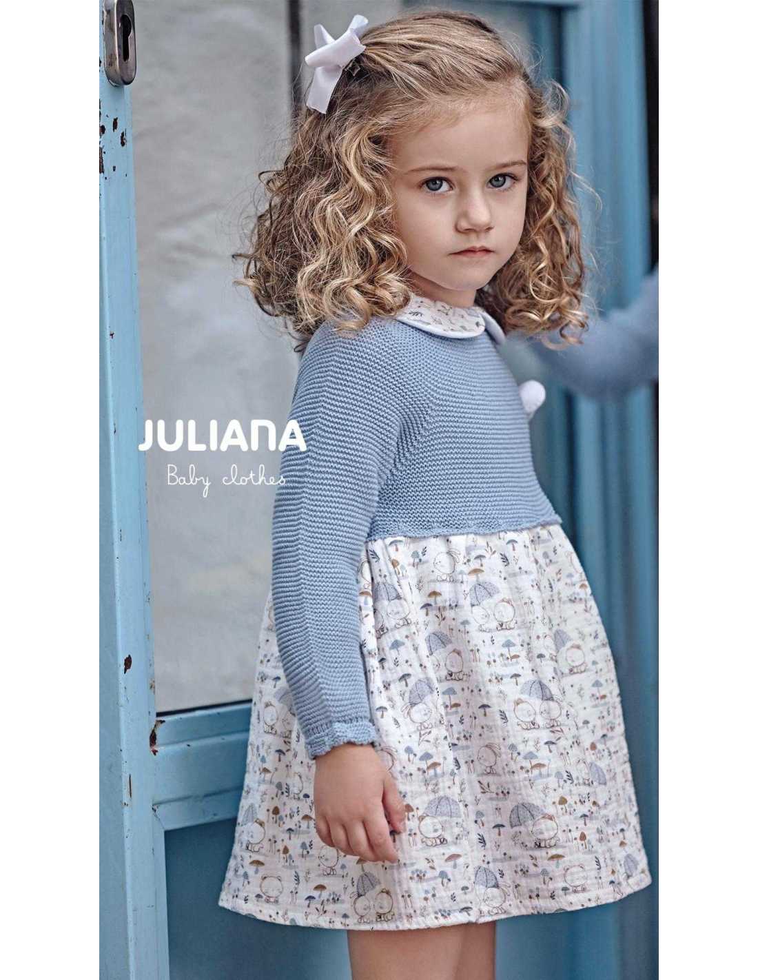 Vestido de Niña, de corte en la cintura, manga larga tipo renglan, con el cuerpo de punto azul cielo.