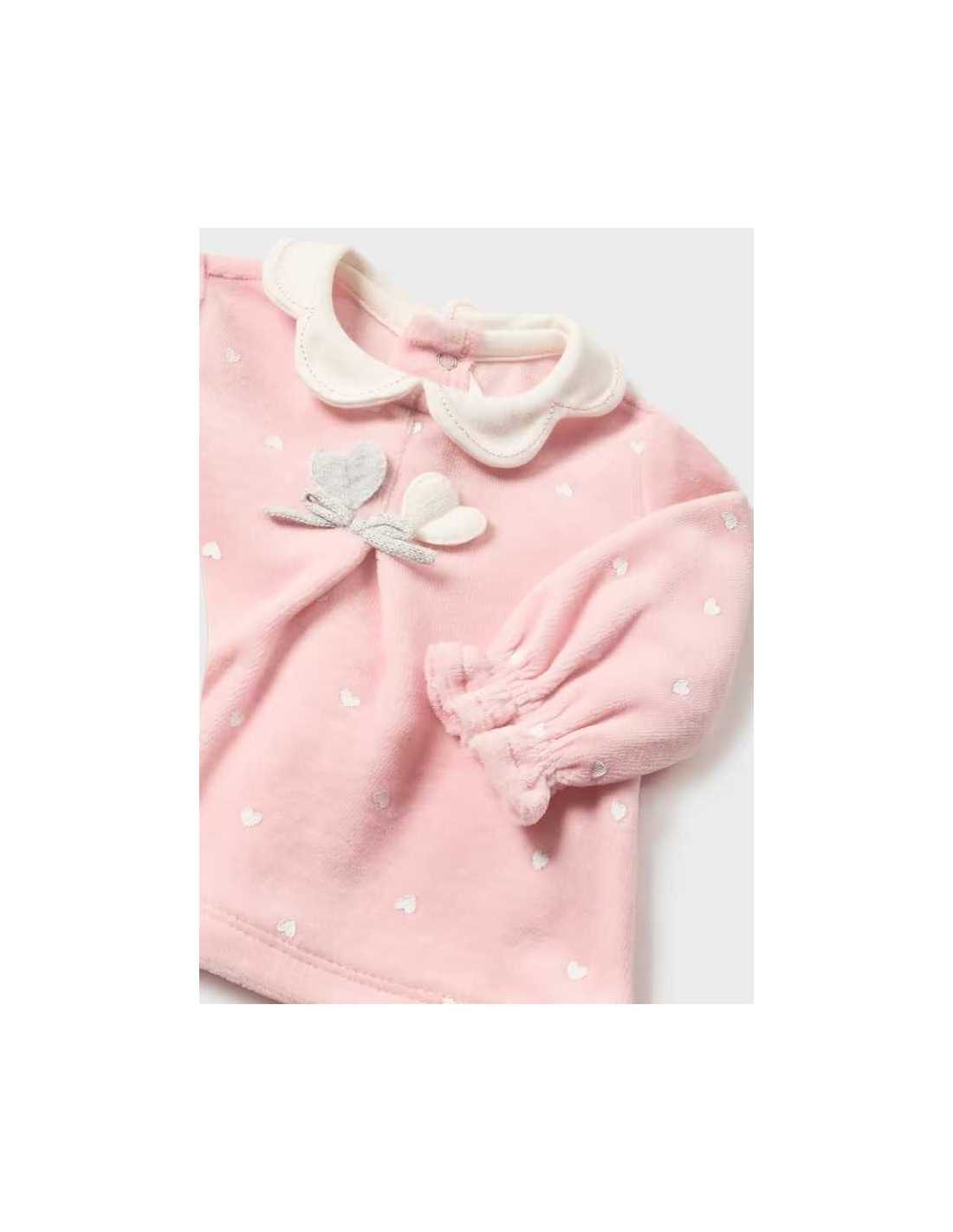 Camiseta de manga larga para recién nacido con puños elásticos. Cuello con ondas. Cierre con botones a presión en la parte posterior. Suave tejido de velour de tacto aterciopela Estampado de corazones.
