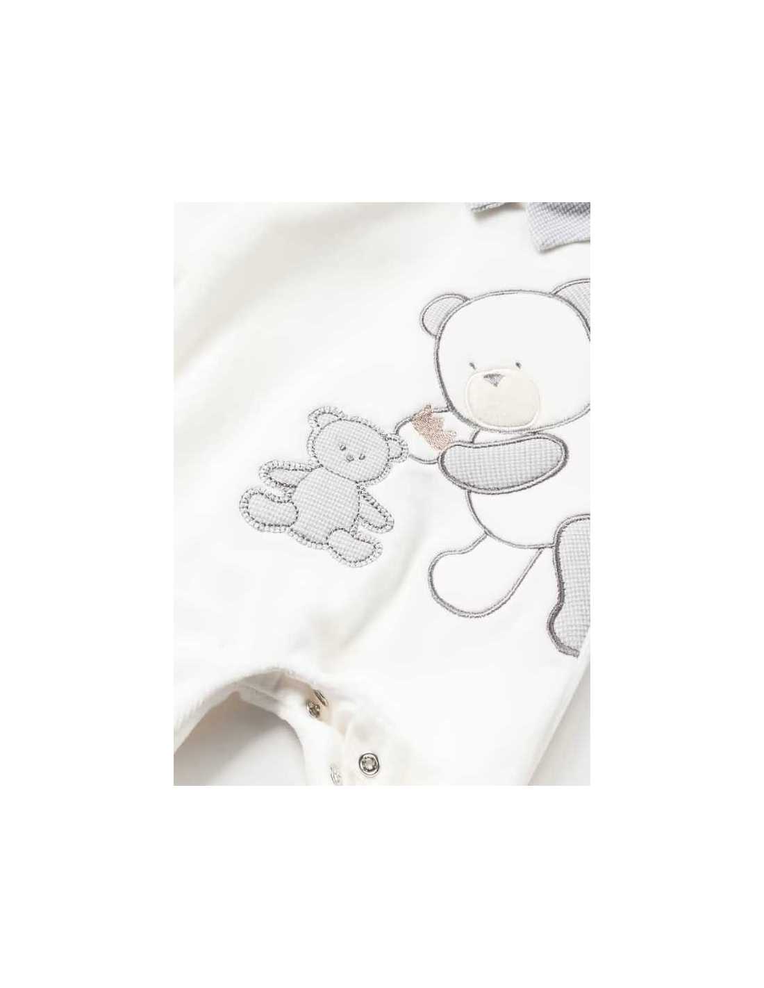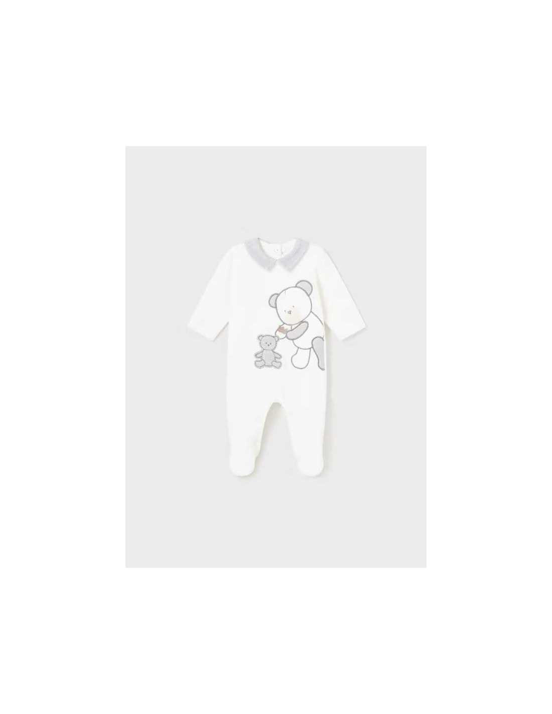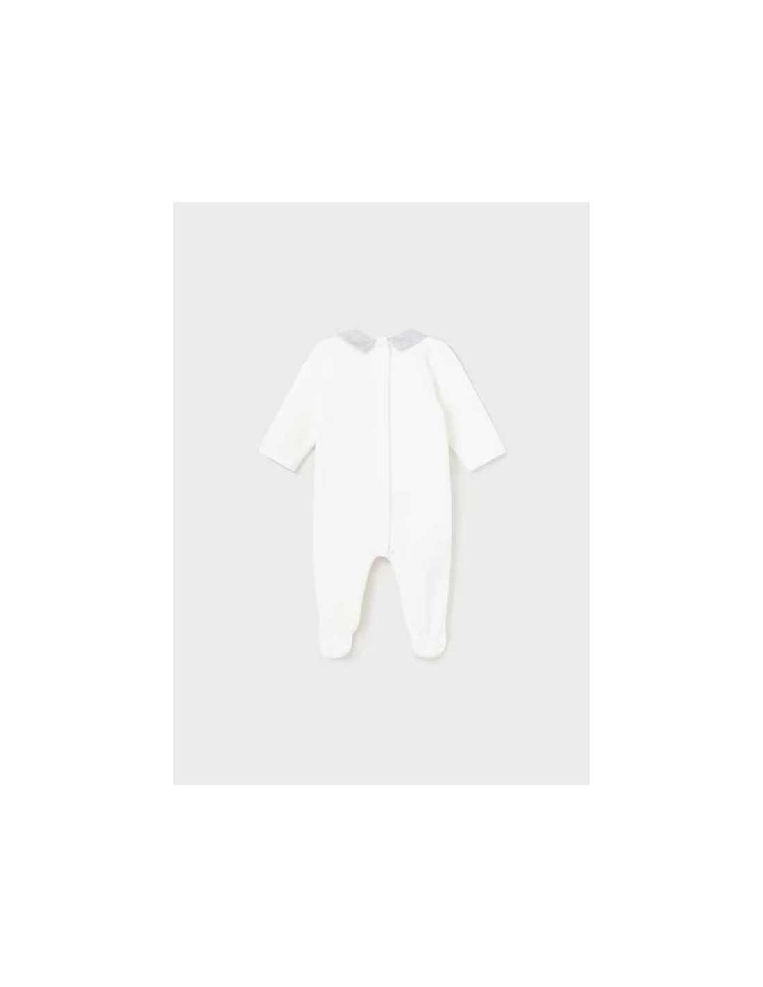 Pijama de manga larga para recién nacido. Cuello bebé. Cierre con botones a presión en la parte posterior. Cierre con botones a presión en la entrepierna para facilitar la puesta de la prenda. Cálido tejido de algodón con tacto suave y aterciopelado. Elementos de adorno: bordados. Las tallas mayores de este modelo (12 y 18 meses) presentan una suela antideslizante.