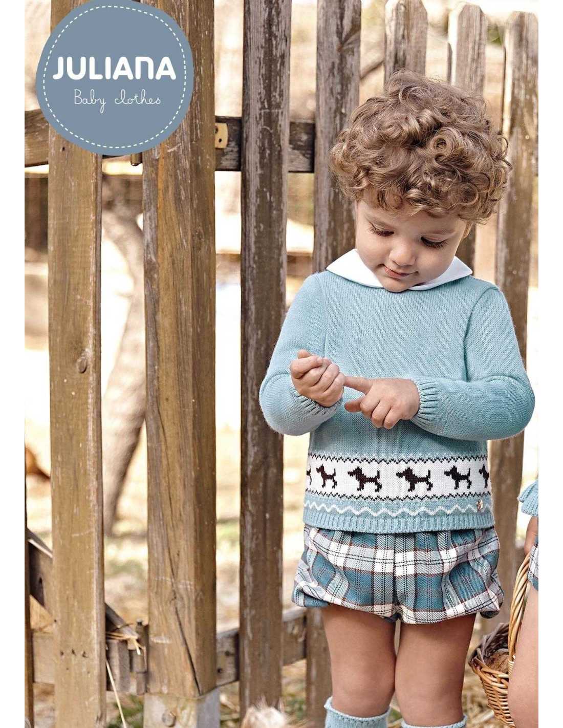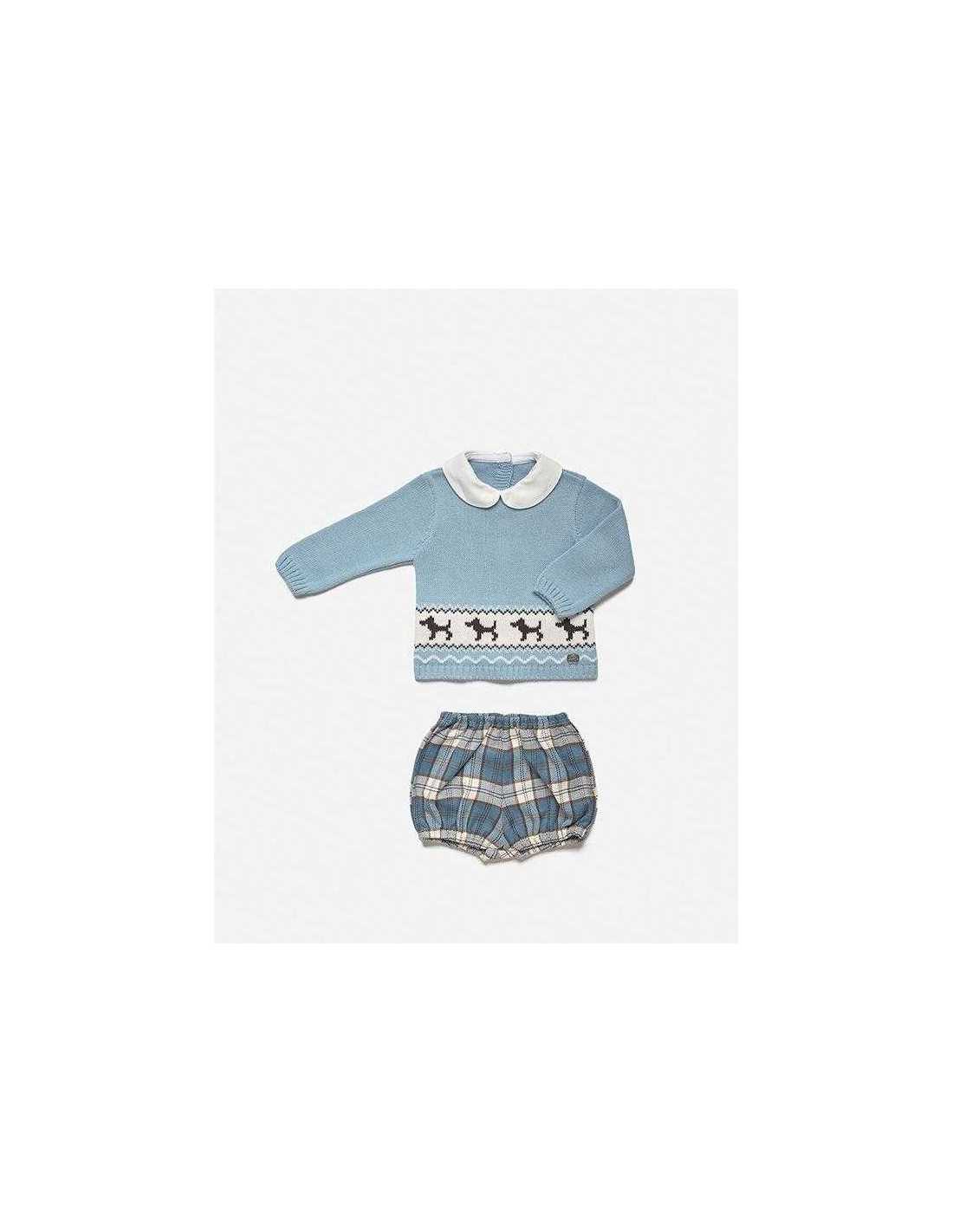 Elegante conjunto de dos piezas de Juliana para bebé niño compuesto de jersey azul, con cenefa blanca y trama de perritos.