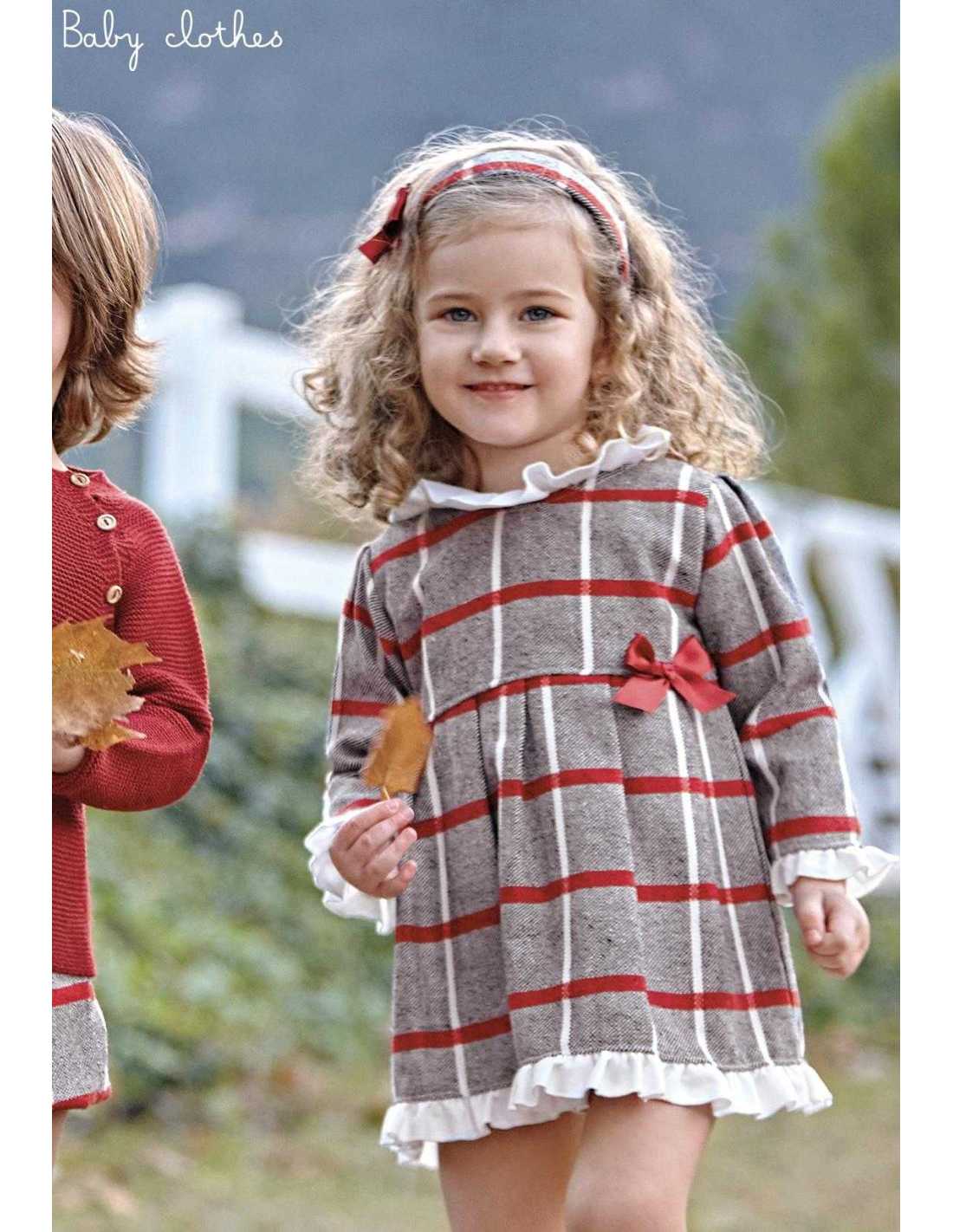Vestido Infantil de corte en la cintura, manga larga, confeccionado en tela de color gris estampado de cuadros rioja y blanco.