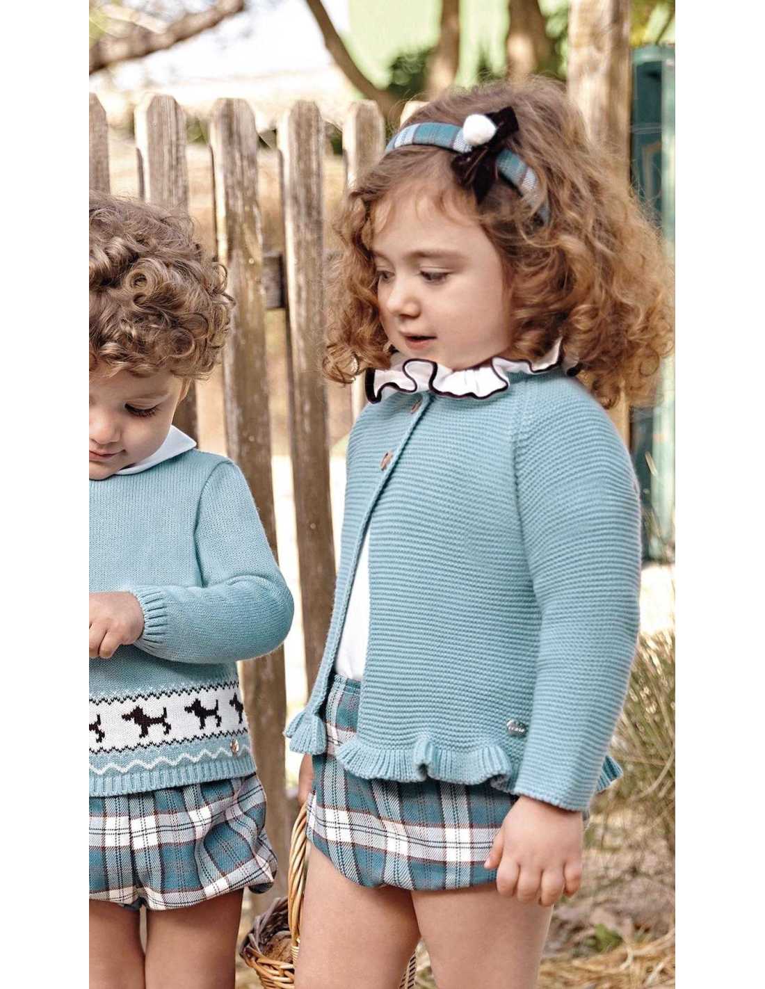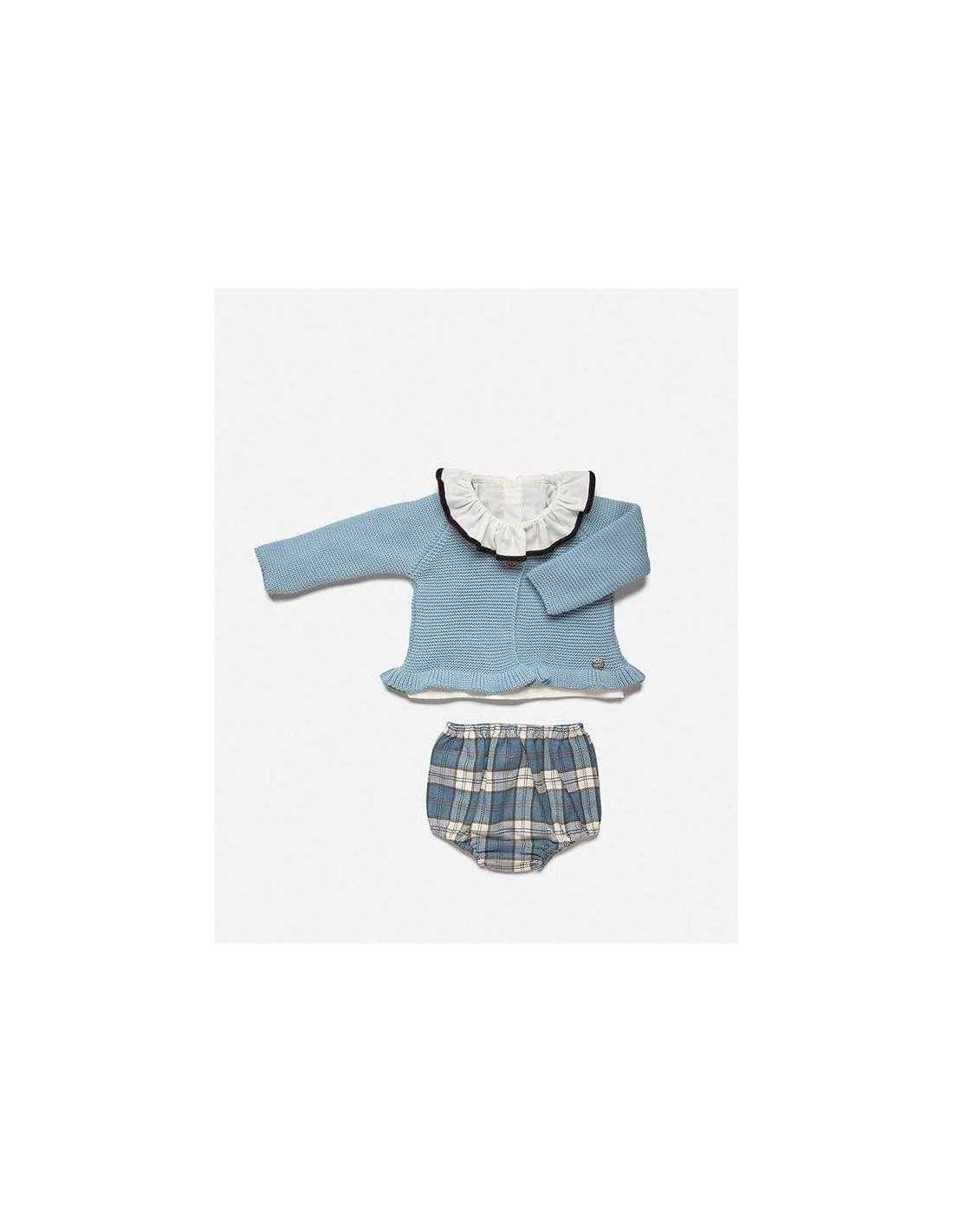 Conjunto de tres piezas de braguita de cuadros en tono azul y marrón, con gomas en las perneras.