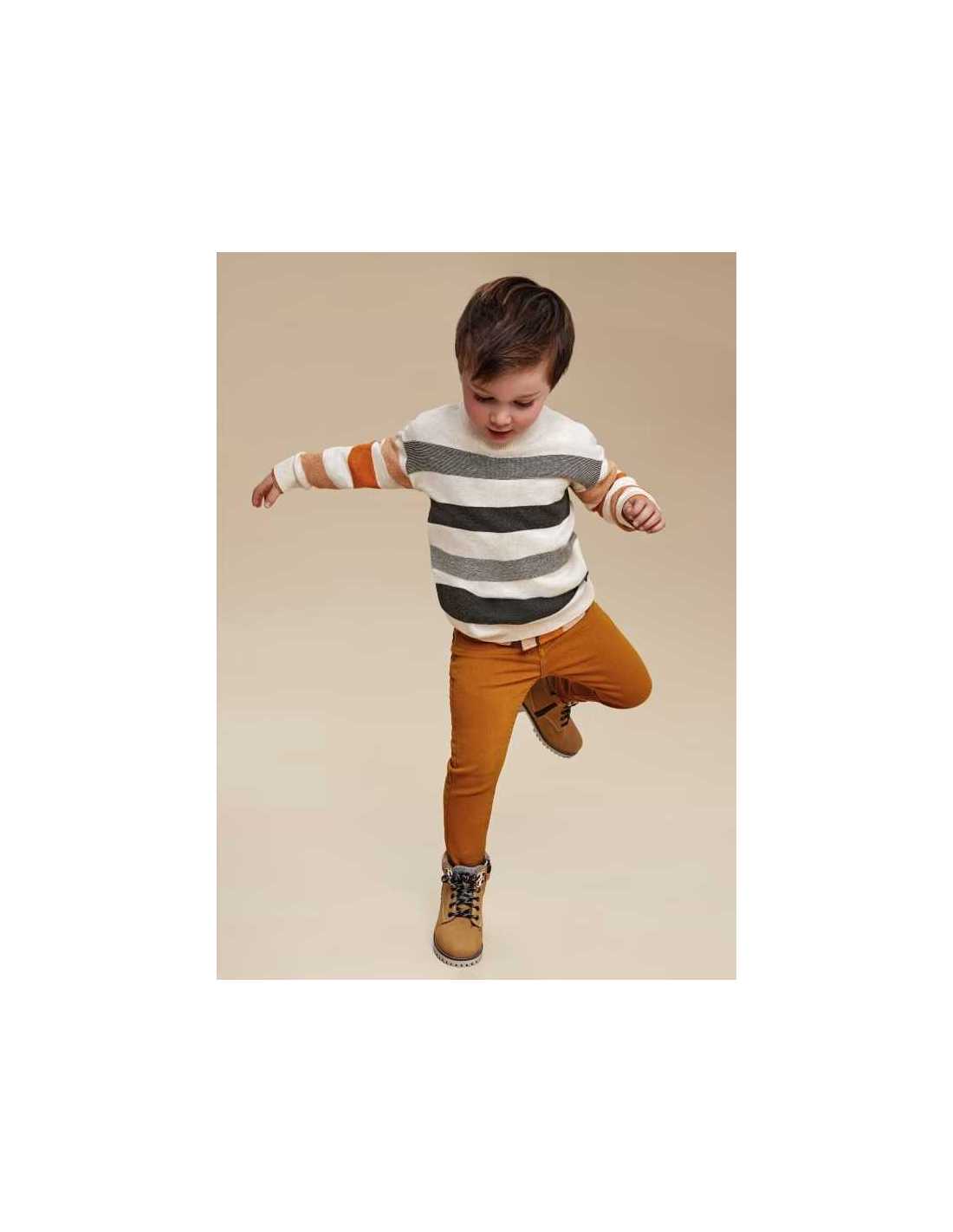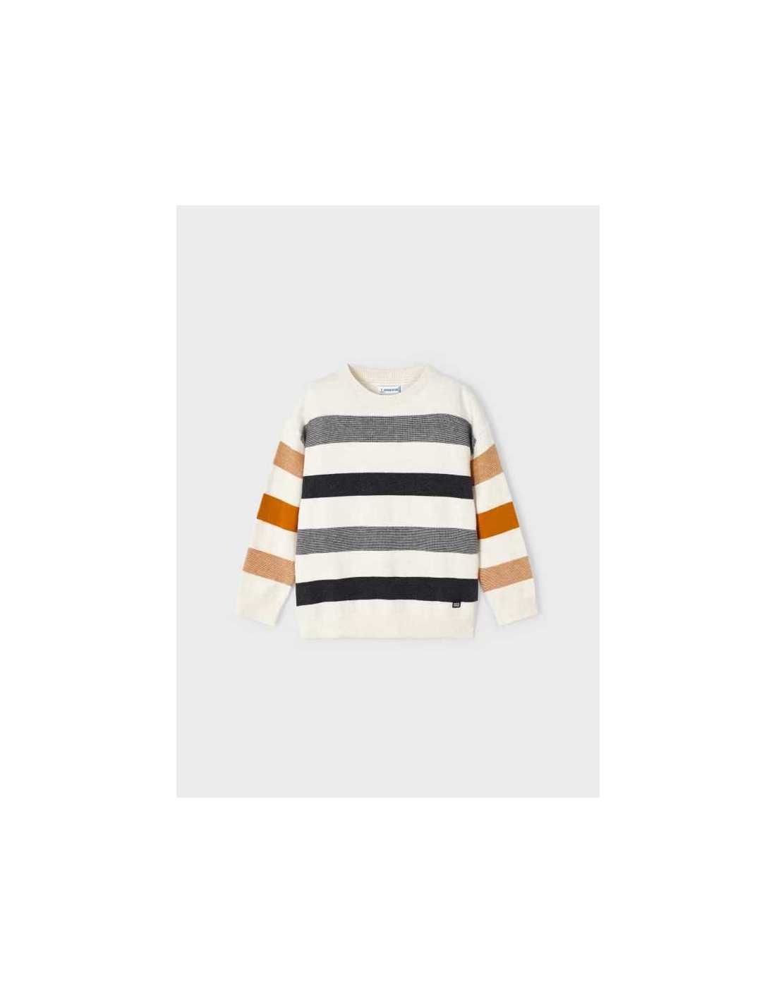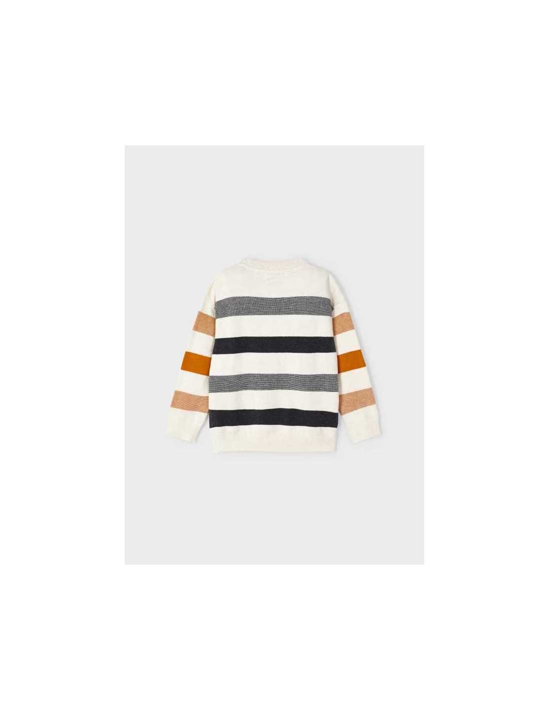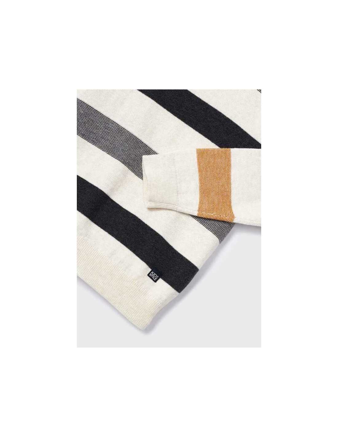 Jersey de manga larga para niño con puños elásticos. Silueta de líneas relajadas con hombros caídos. Tejido de punto con lana. Bajo elástico para un mejor ajuste. Motivo de rayas.