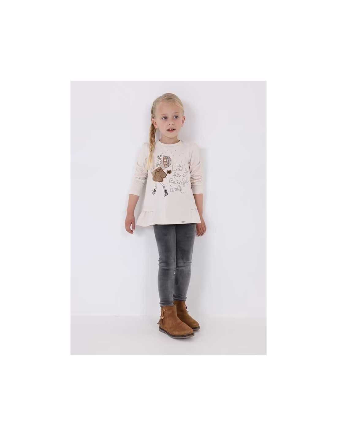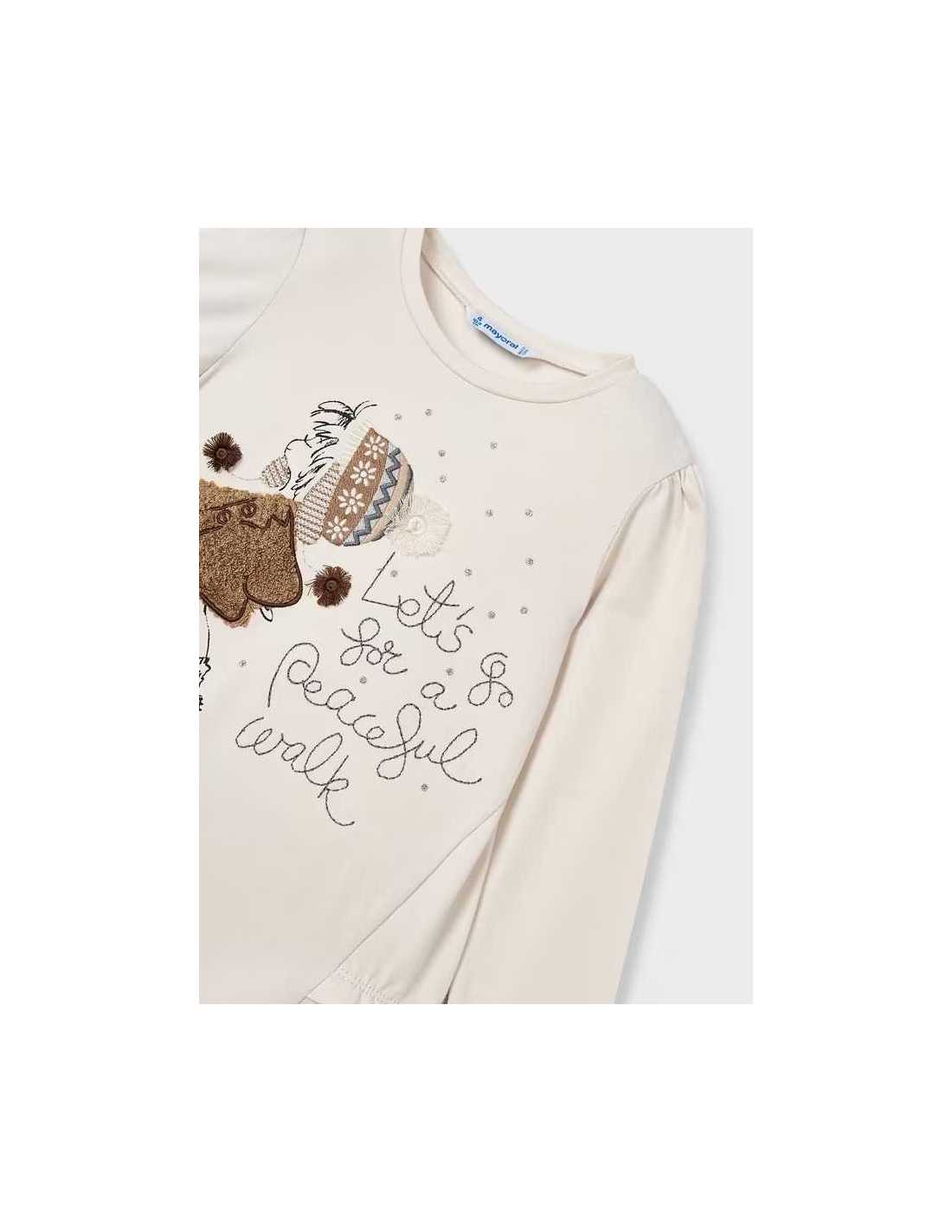 Camiseta de manga larga para niña. Suave tejido de algodón elástico. Diseño con volante decorativo en el bajo de la prenda. Elementos de adorno: dibujo en la parte delantera, glitter, aplique de lazo, strass. Por motivos de seguridad, las tallas pequeñas (2-3 años) pueden sufrir algunas variaciones en los elementos decorativos que se usen en el diseño.