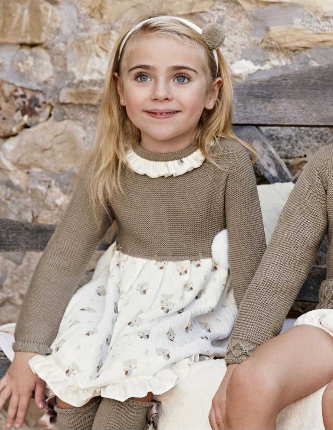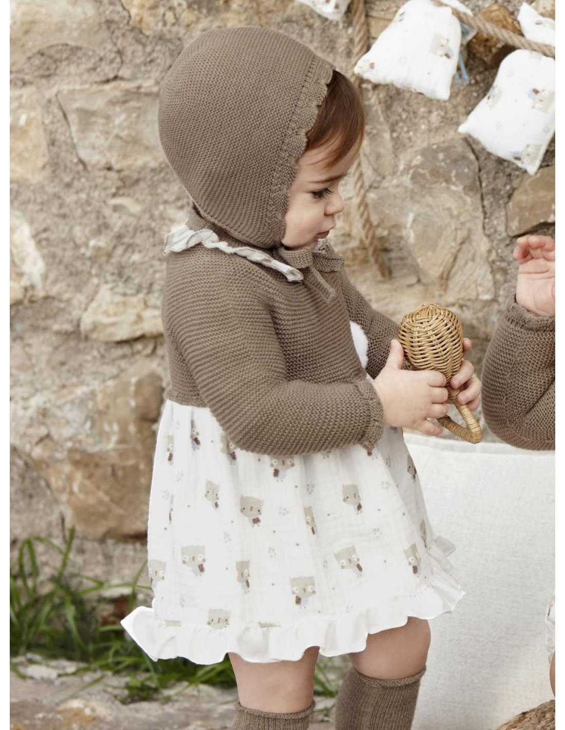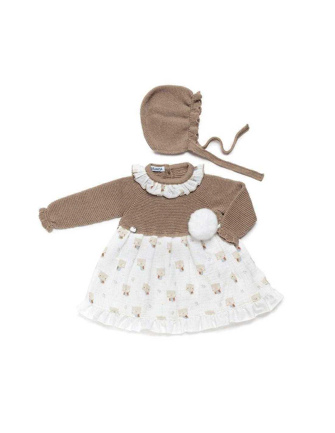 Vestido para bebé niña de la marca Juliana, con el cuerpo de punto de manga larga tipo renglán color antracita, con cuello redondo y volante de tela gris estampada de florecitas en el cuello. La falda es de tela gris estampada de florecitas. Cierra con botonadura vista en la espalda
