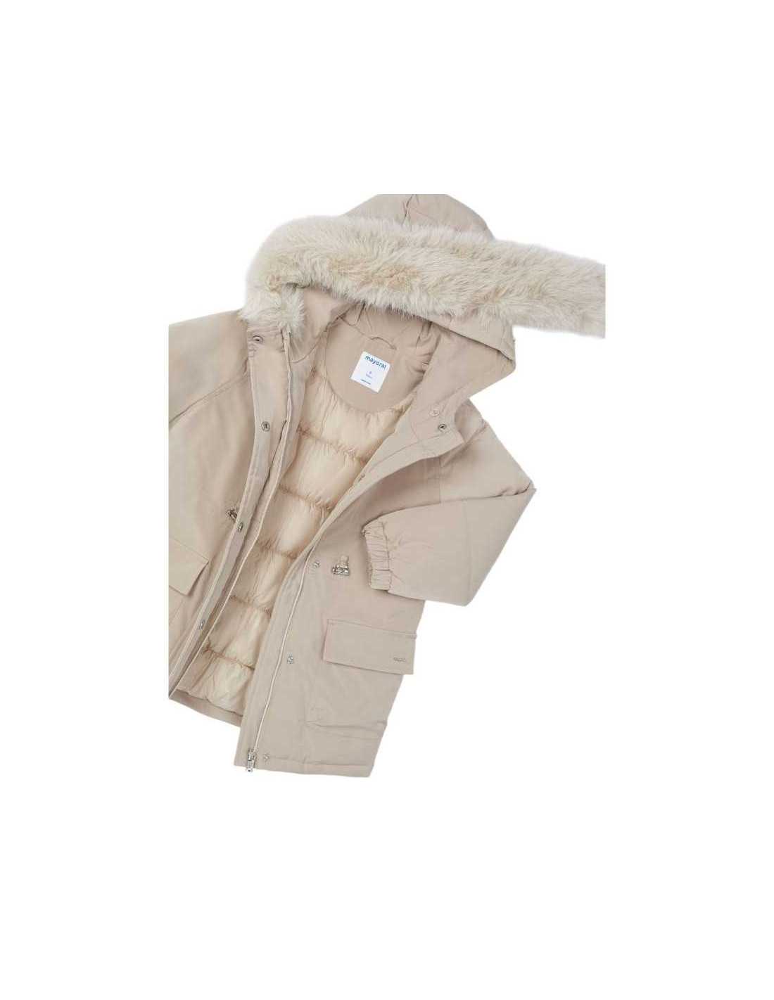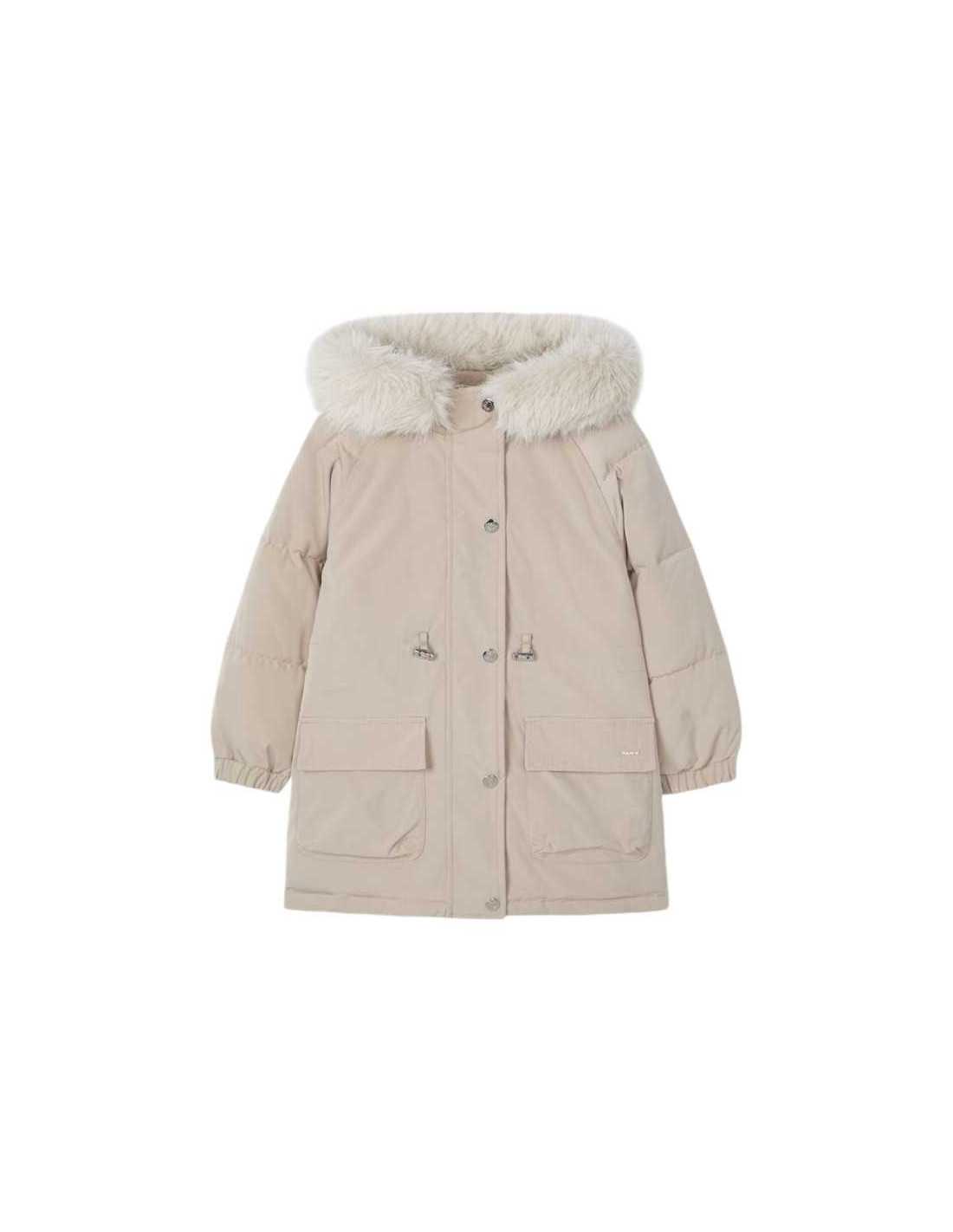 Relleno de la prenda 100% poliéster reciclado. Chaquetón de manga larga para niña con puños elásticos. Capucha fija con borde de pelo extraíble. Cierre con cremallera frontal y botones a presión. Ligero tejido técnico transpirable de gran comodidad. Cálido interior acolchado. Bolsillos funcionales en la parte delantera.