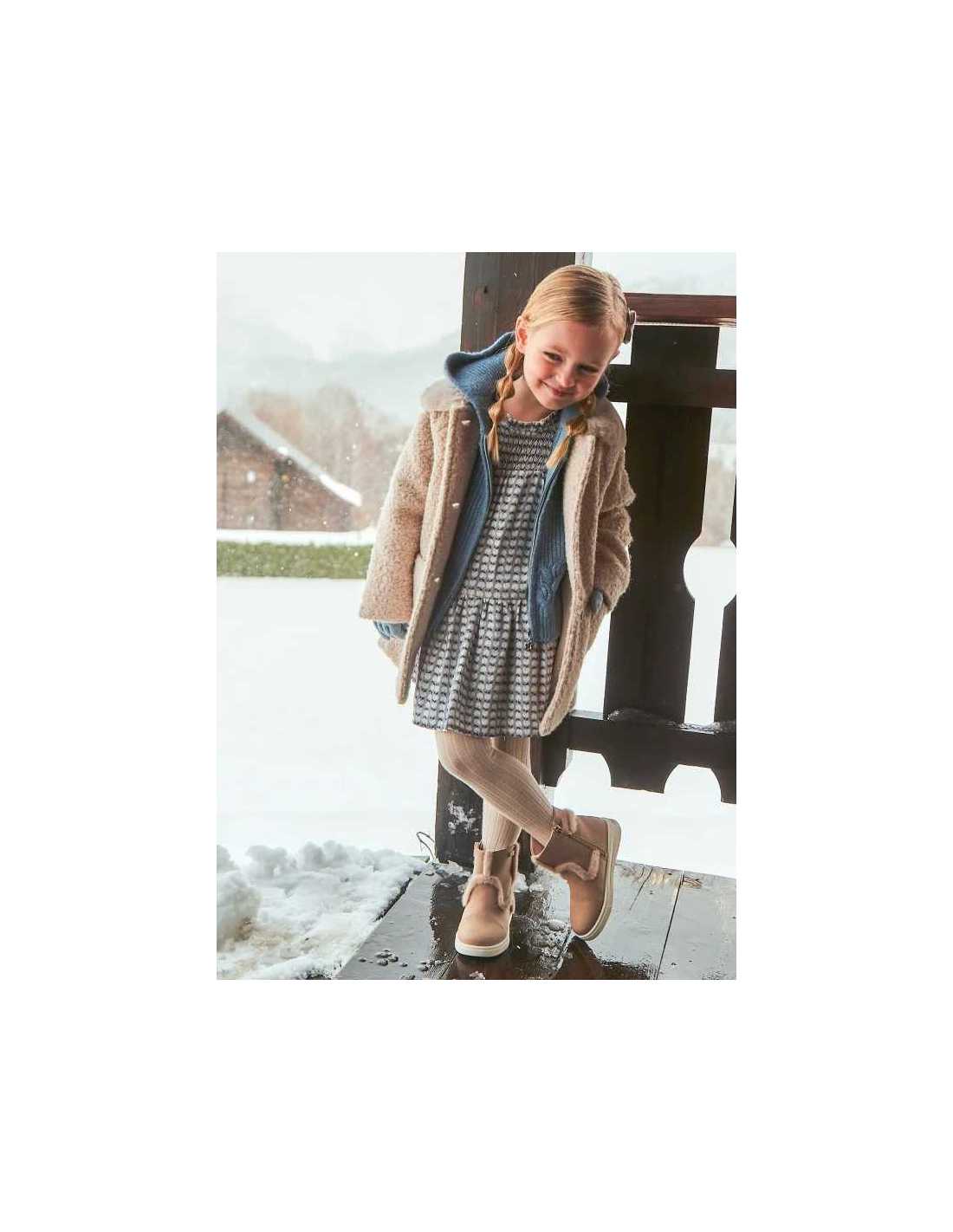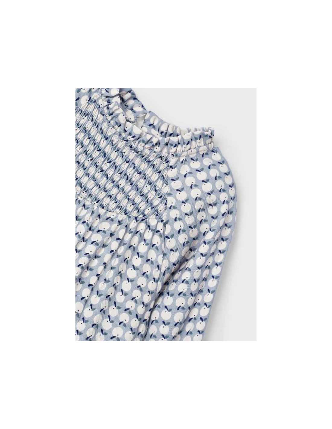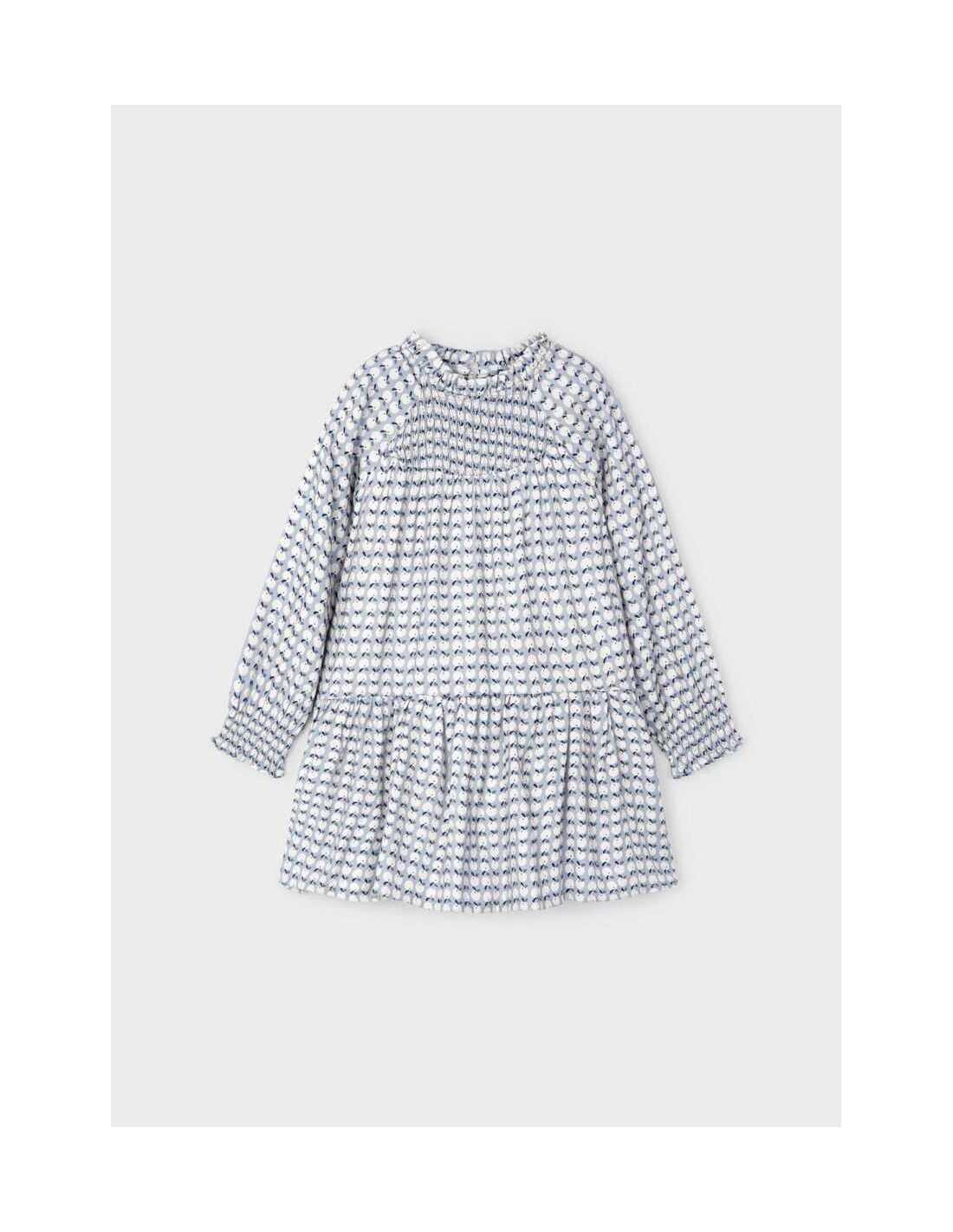 Vestido de manga larga para niña con puños elásticos. Pequeña abertura en la espalda con cierre de botón para facilitar la puesta de la prenda. Cálido y suave tejido de viella. Modelo con rizo y volantes. Diseño con punto smock. Diseño estampado.