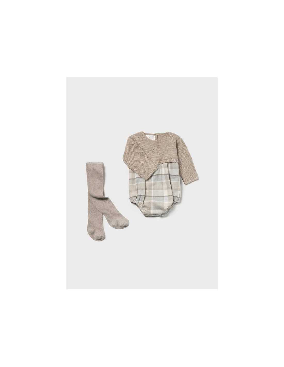 Pelele de manga larga para recién nacido. Botones a presión en la entrepierna para facilitar la puesta de la prenda. Cierre con botones en la espalda para facilitar la puesta de la prenda. Motivo de cuadros.